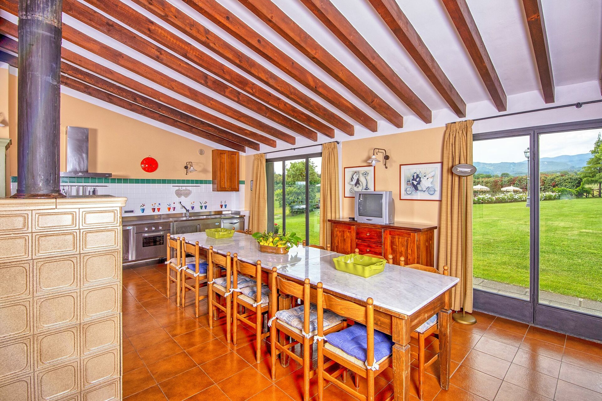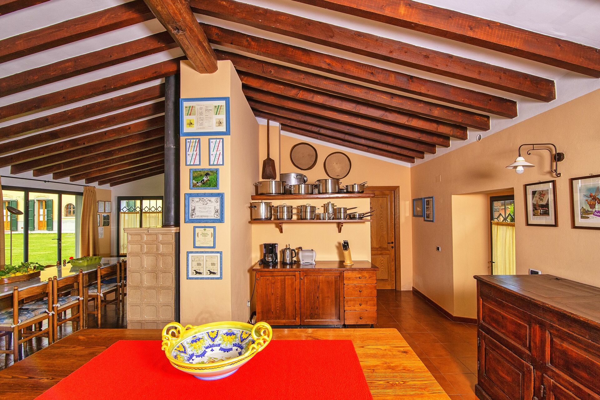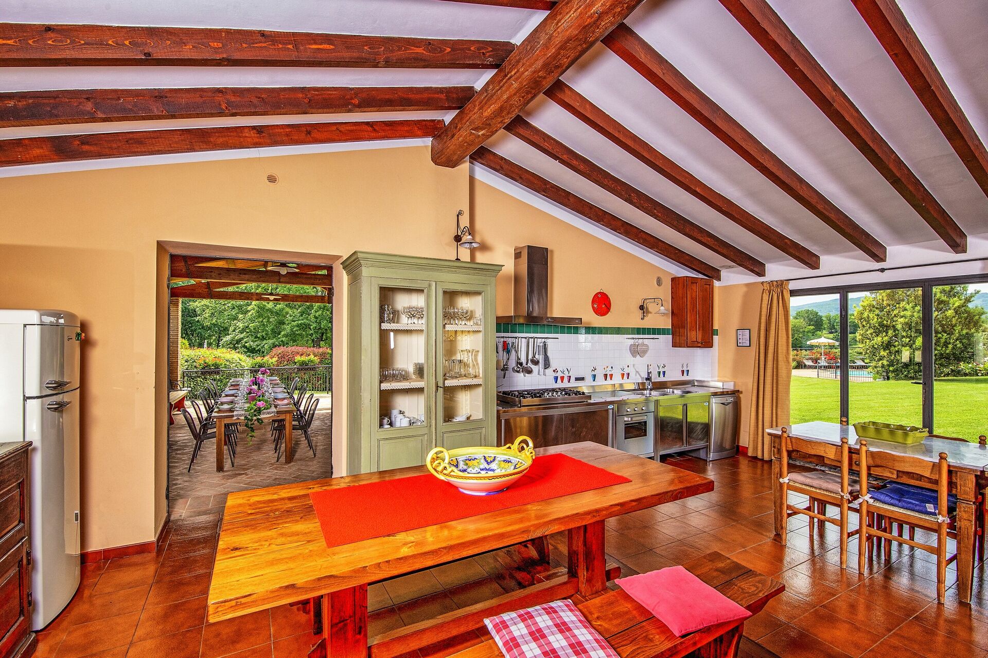 Charakteristisch ist auch das gegenüberliegende Nebengebäude, in dem sich ein großes Esszimmer mit einer bestens ausgestatteten Küche, ein Holzofen für Pizza sowie eine überdachte Terrasse mit Barbecue befinden – der ideale Ort, um Mahlzeiten zuzubereiten und gemeinsam im Freien zu speisen.