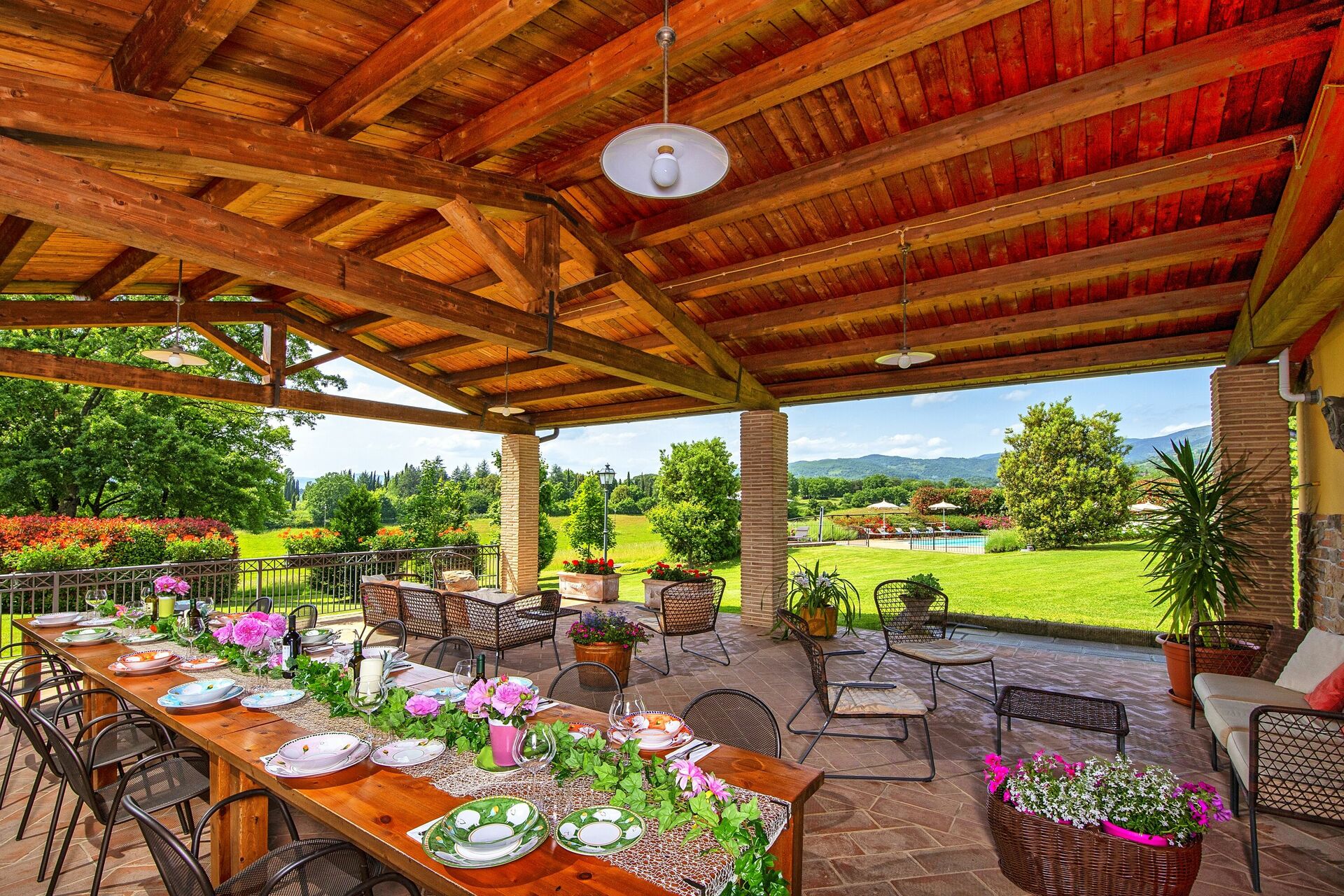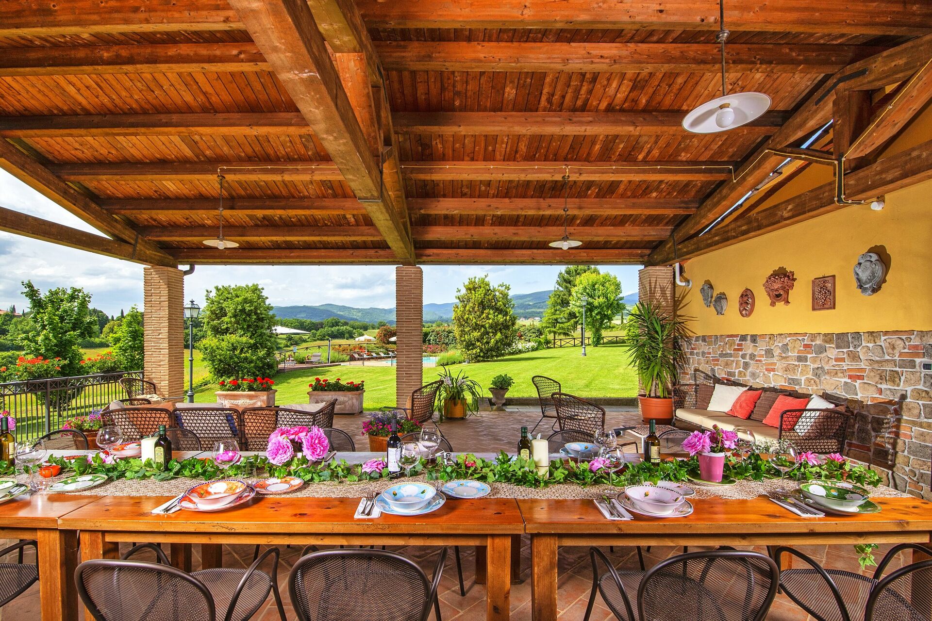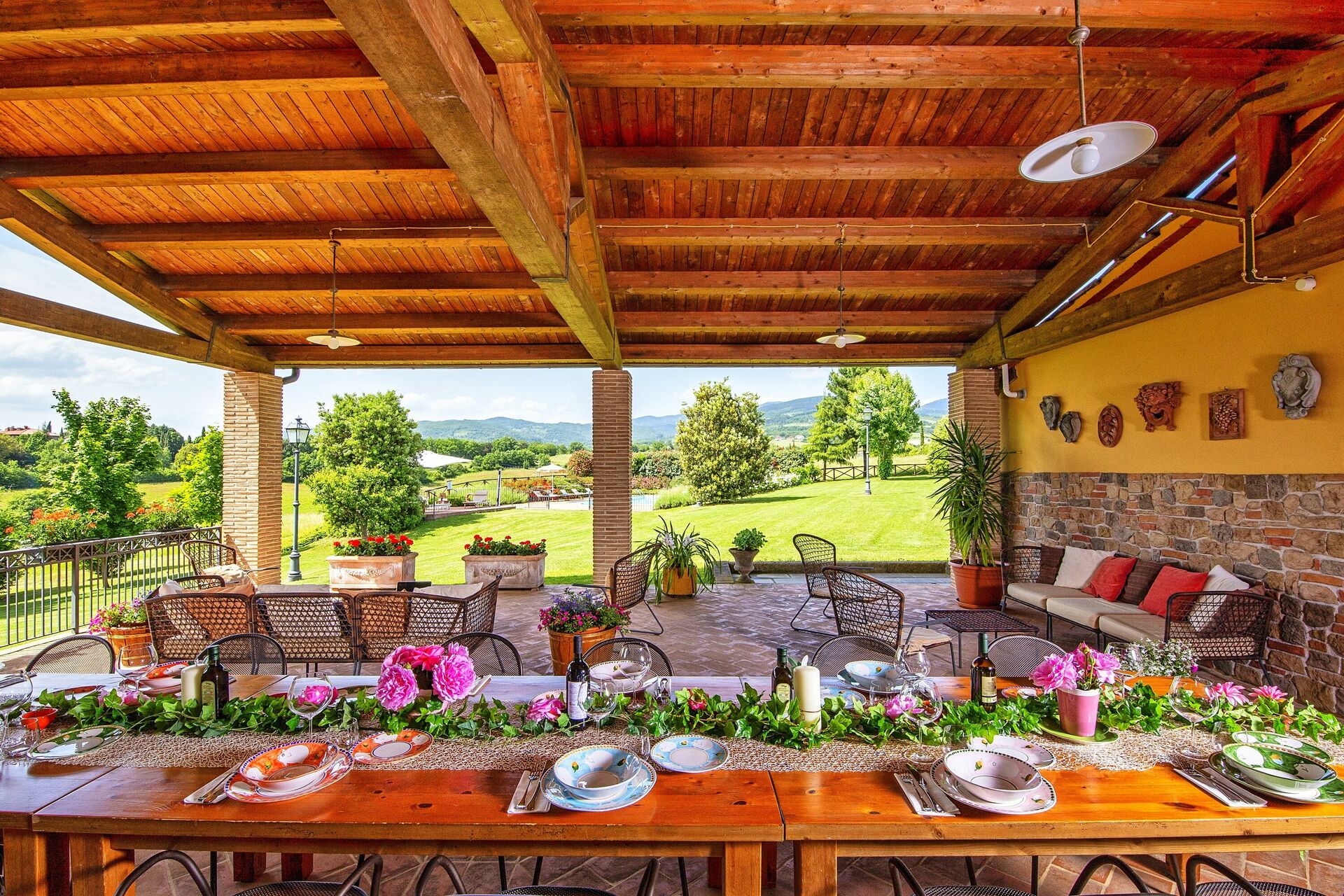 Charakteristisch ist auch das gegenüberliegende Nebengebäude, in dem sich ein großes Esszimmer mit einer bestens ausgestatteten Küche, ein Holzofen für Pizza sowie eine überdachte Terrasse mit Barbecue befinden – der ideale Ort, um Mahlzeiten zuzubereiten und gemeinsam im Freien zu speisen.