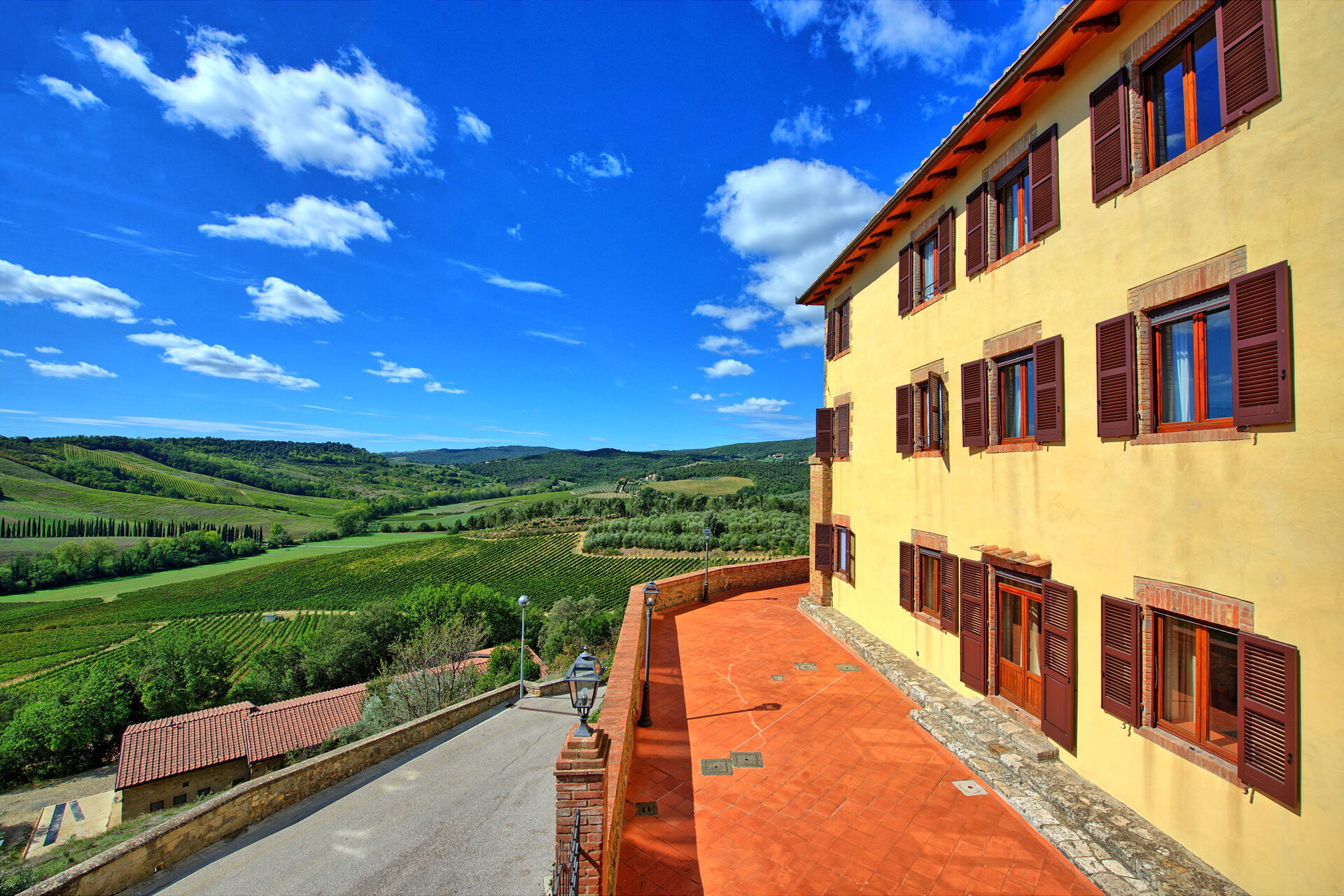 Großes Anwesen auf einem Hügel, nur wenige Kilometer von San Gimignano entfernt, vollständig umgeben von Weinbergen und Olivenhainen.
