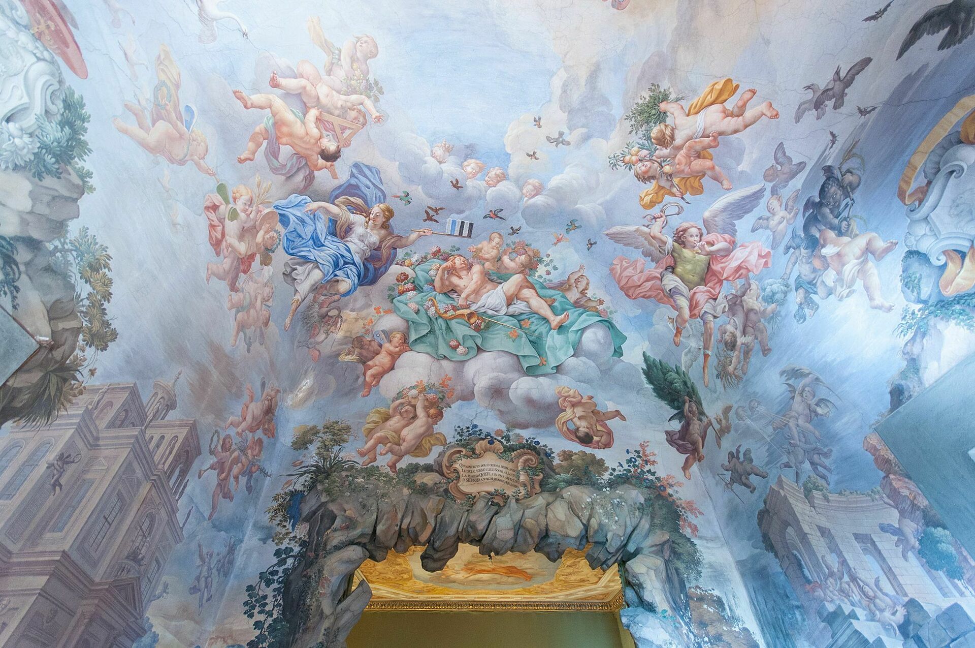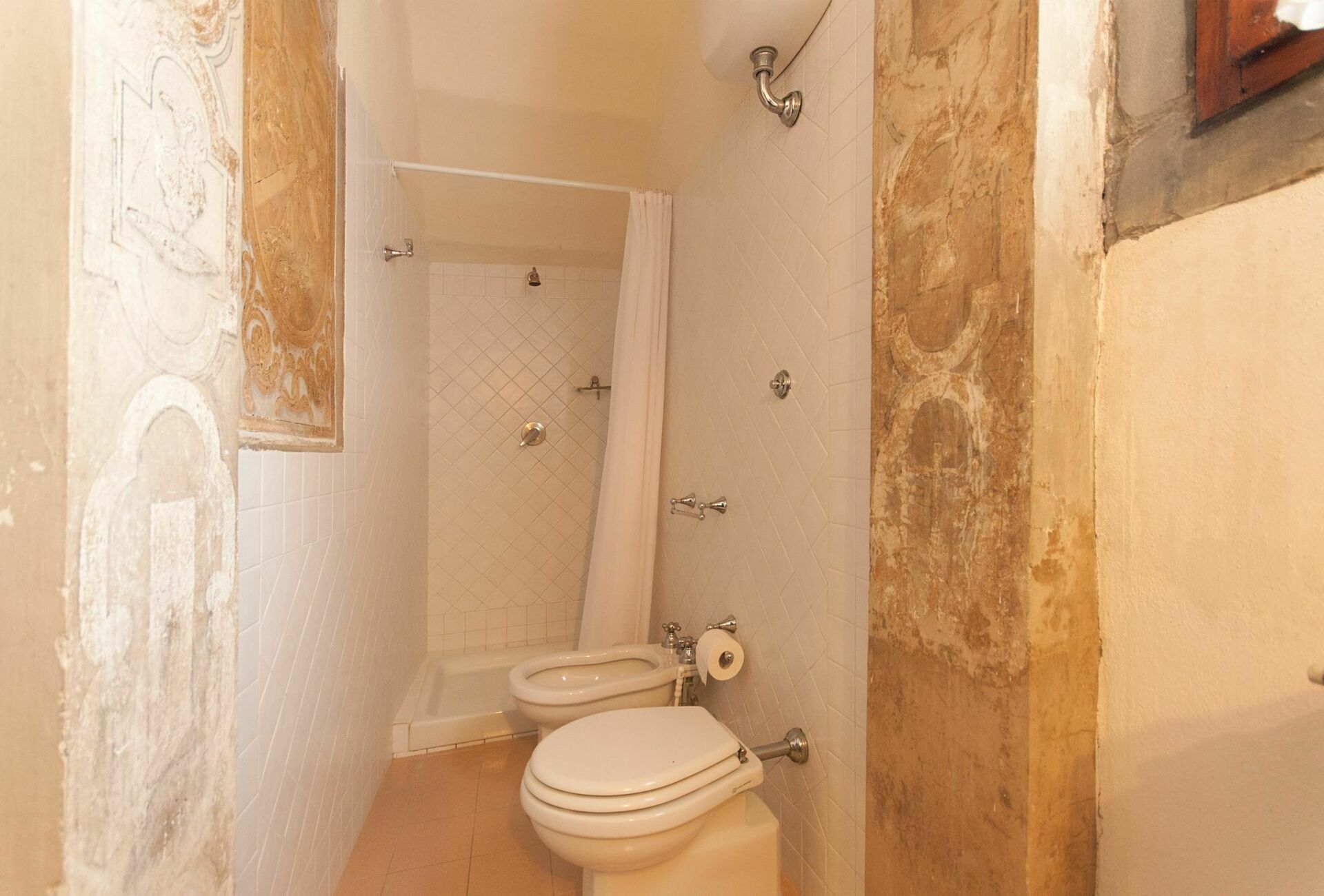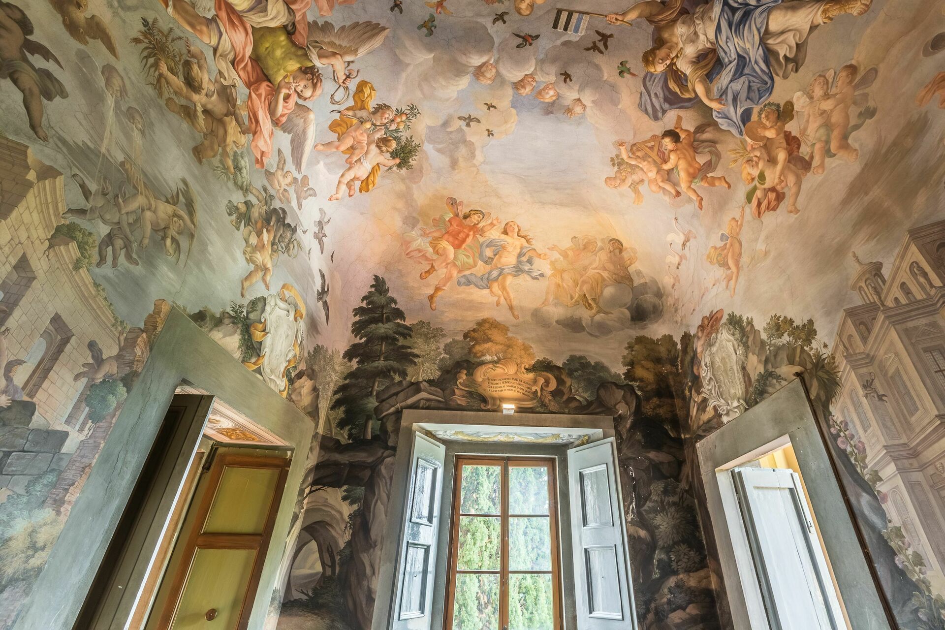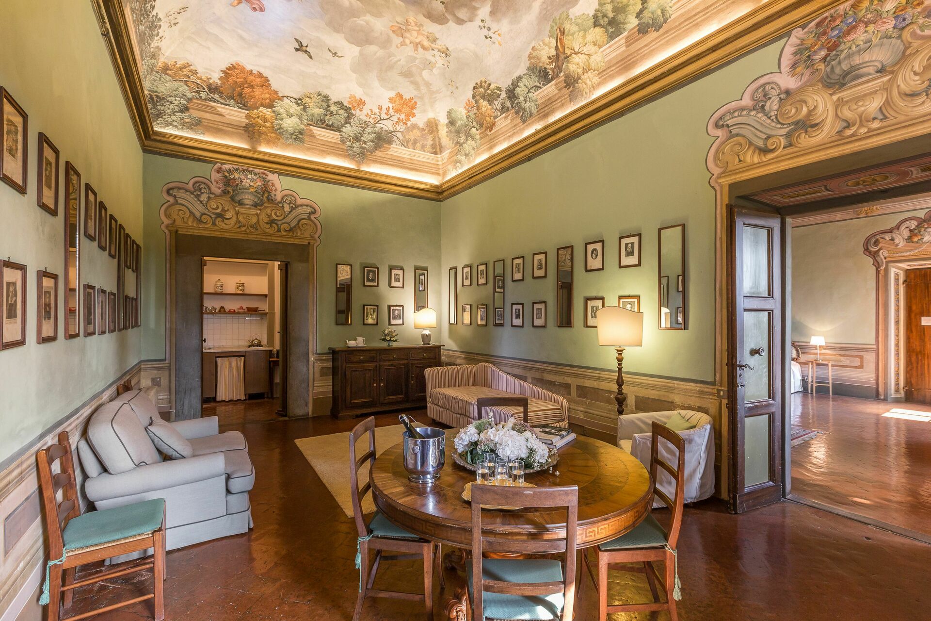 Erdgeschoss: Vorraum mit Kochecke und Bad mit Dusche, Wohnraum mit Esstisch und Einzelschlafsofa, Doppelzimmer mit Bad mit Dusche, Doppelzimmer. Alle Räume sind mit wunderschönen Fresken aus dem 17. Jahrhundert dekoriert und genießen einen malerischen Blick auf den Garten und die umliegende Landschaft.