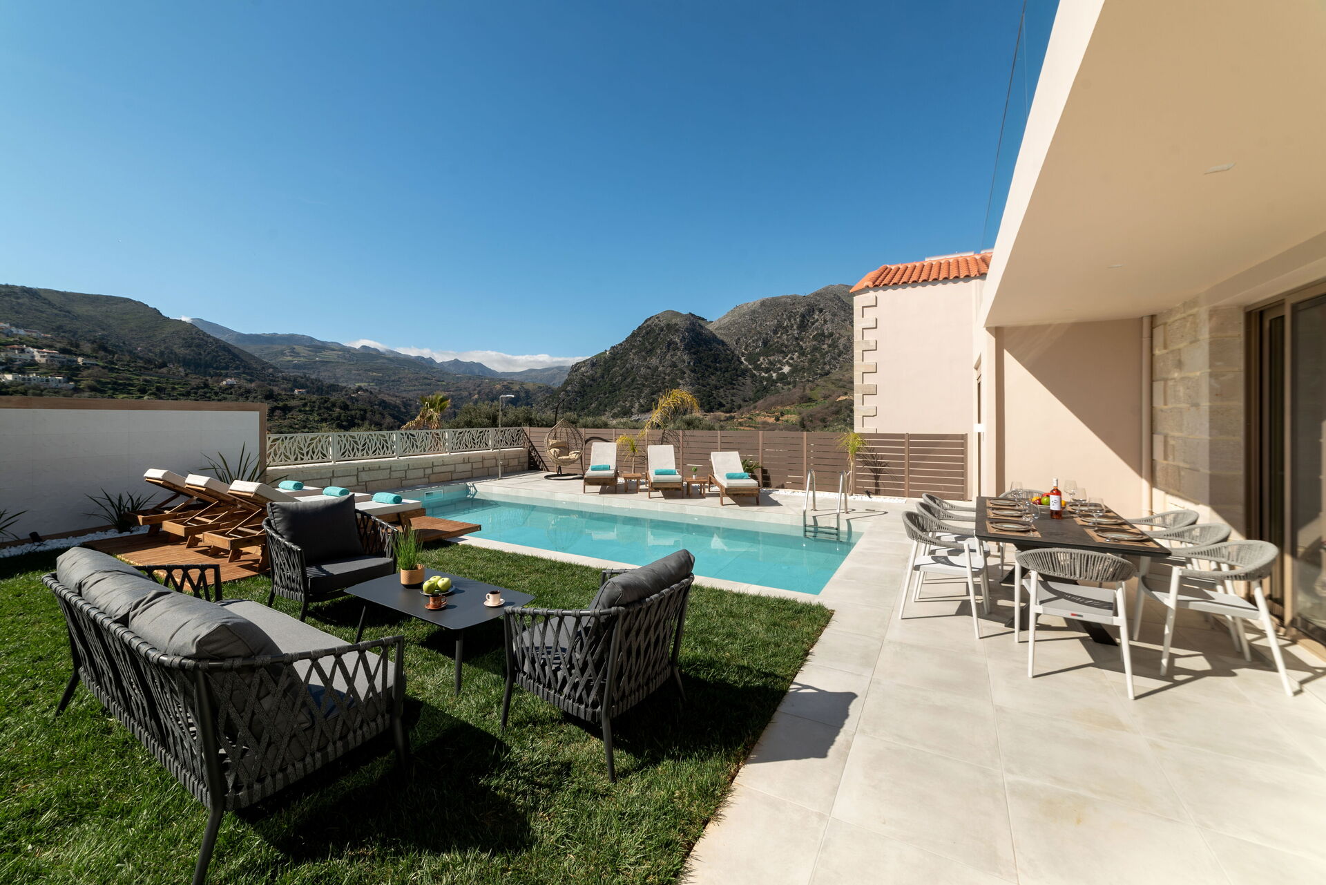 Udenfor er der en dejlig spiseplads, og en smuk privat pool til at slappe af og have det sjovt med familie eller venner på varme Kreta-dage.