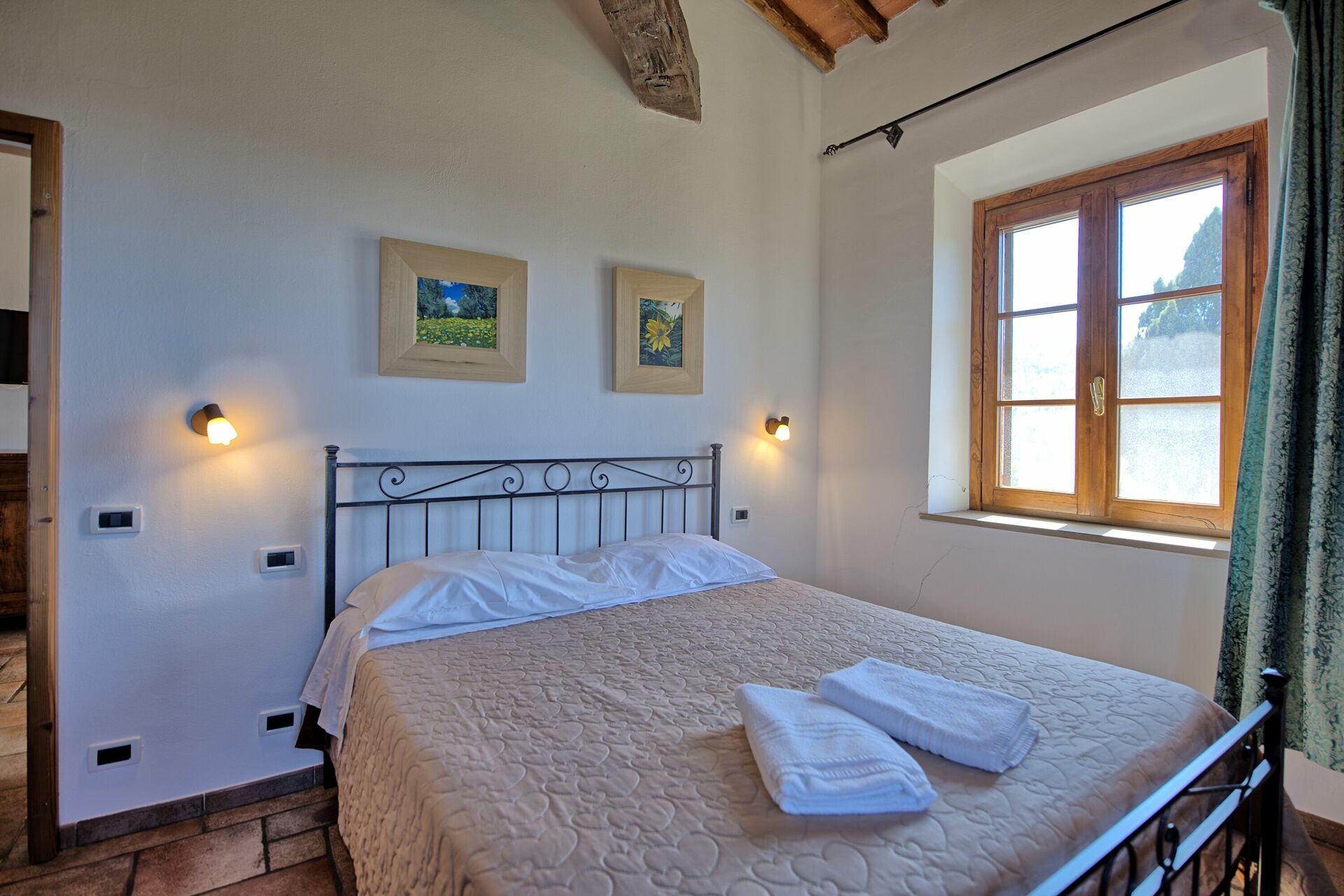 Første sal: indgang til stue (TV) med spiseplads og køkkenhjørne (fryser, mikroovn, opvaskemaskine), soveværelse med dobbeltseng, badeværelse med bruser.