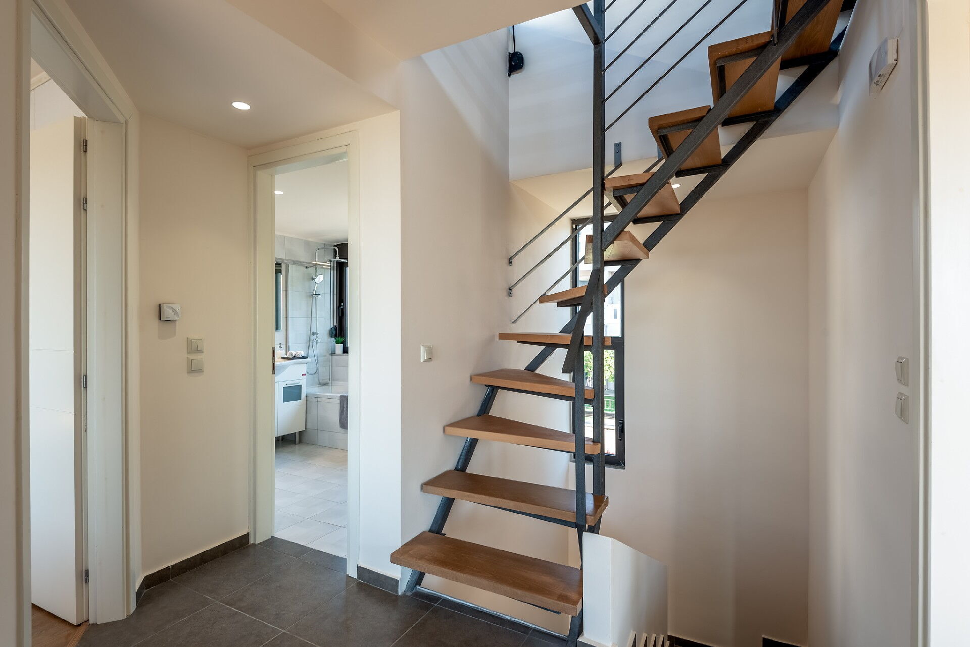 Premier étage: chambre double avec salle de bains privée avec douche, chambre avec deux lits simples, salle de bain avec baignoire (machine à laver). À partir des deux chambres il est possible d’accéder à une très grande terrasse avec table et chaises.
