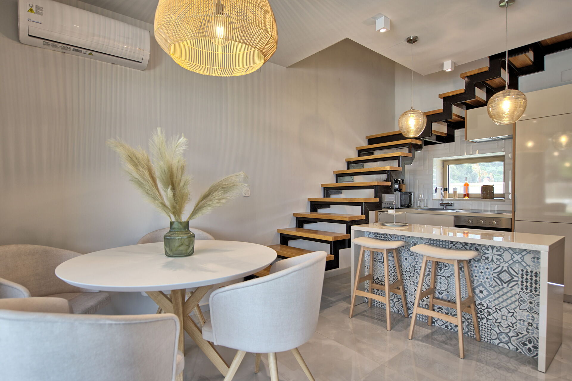 Ground floor: living room (air conditioning) with kitchen corner (cooktop, oven, freezer, dishwasher, coffee maker, microwave, toaster) and dining area; 2 double bedrooms (air conditioning and screens); bathroom with hydro-massage shower