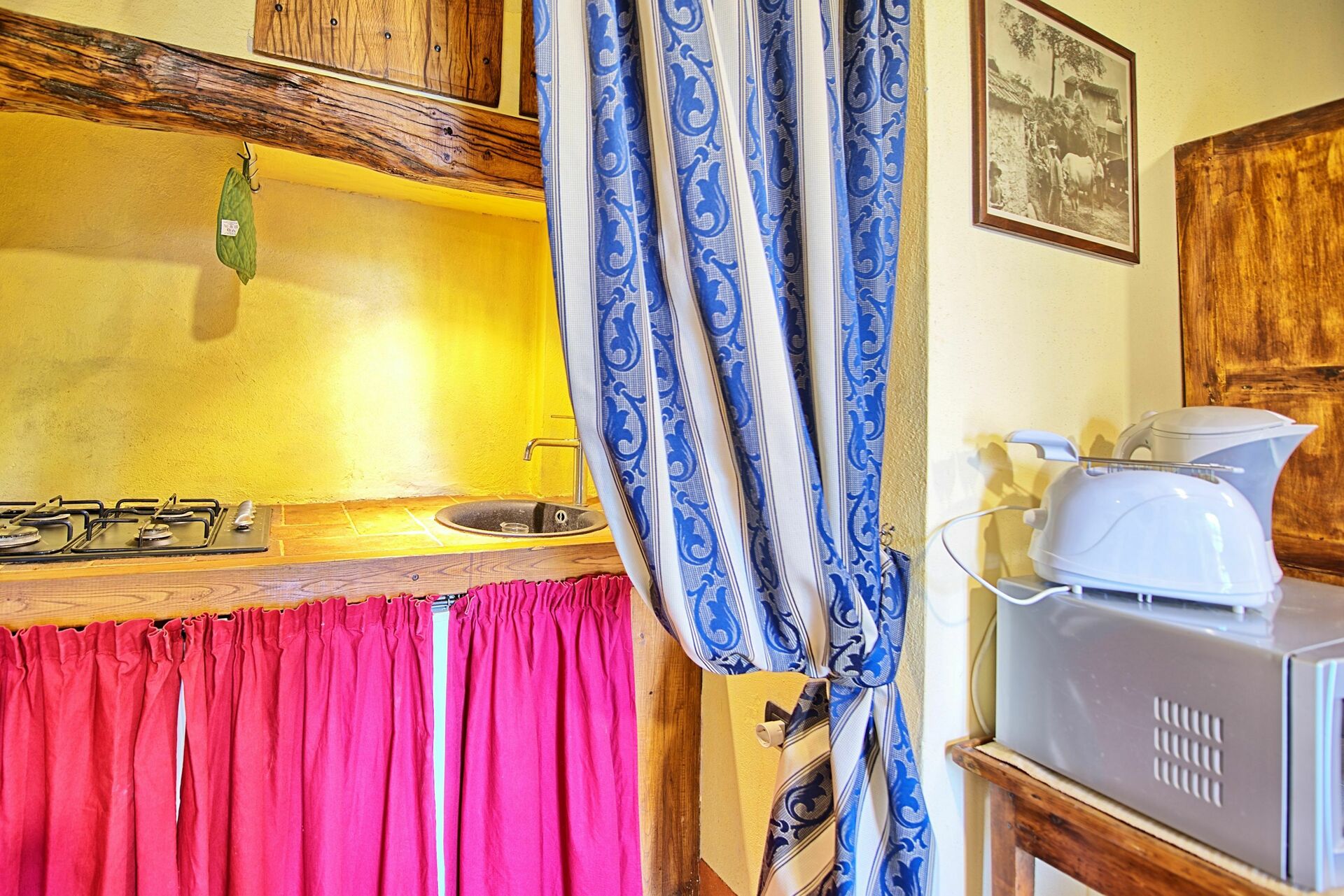 Piano terreno: zona pranzo con poltrona letto e angolo cottura (piccolo forno elettrico/microonde, lavastoviglie), grande camera matrimoniale, bagno con doccia.