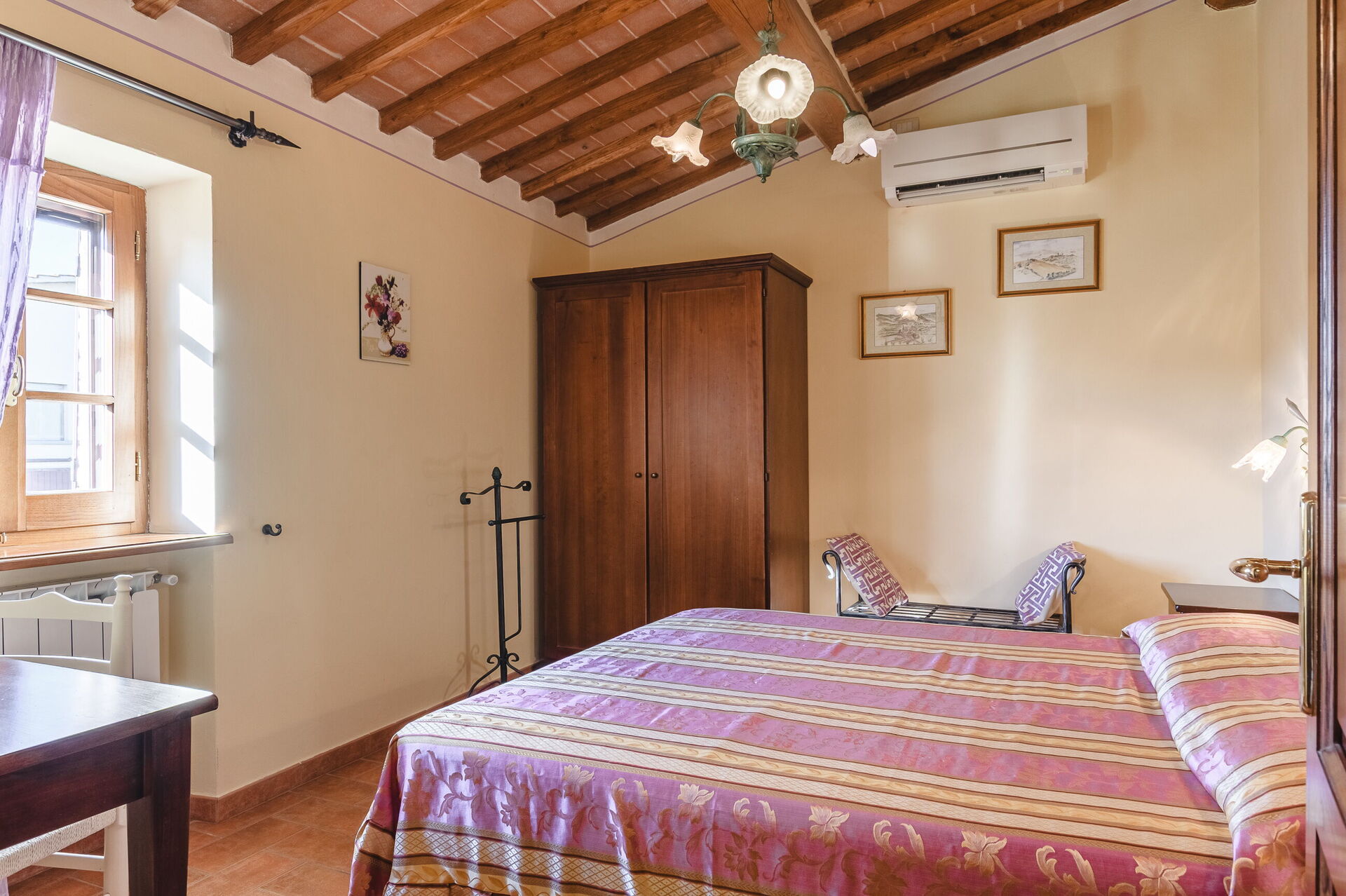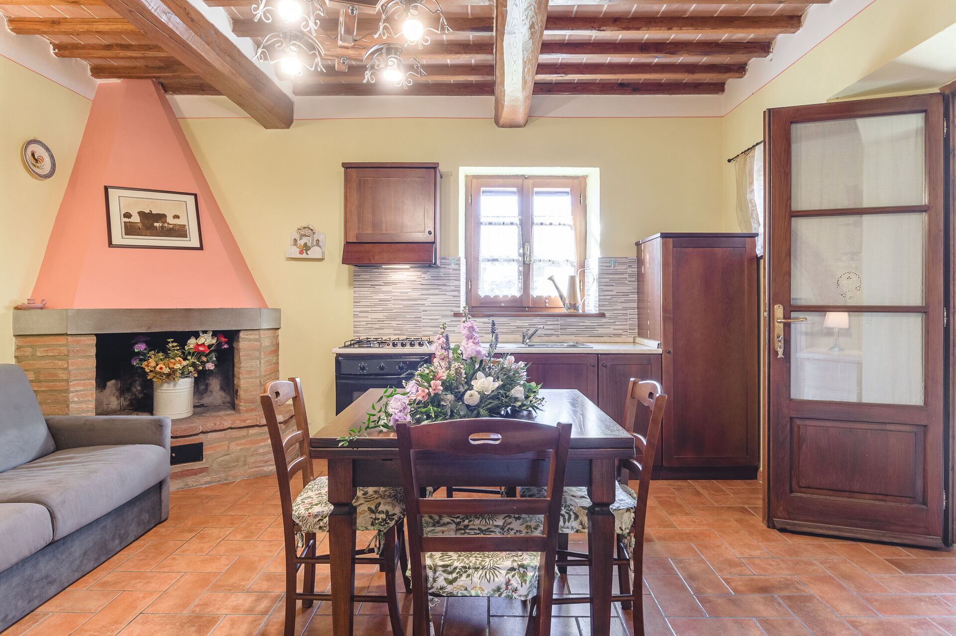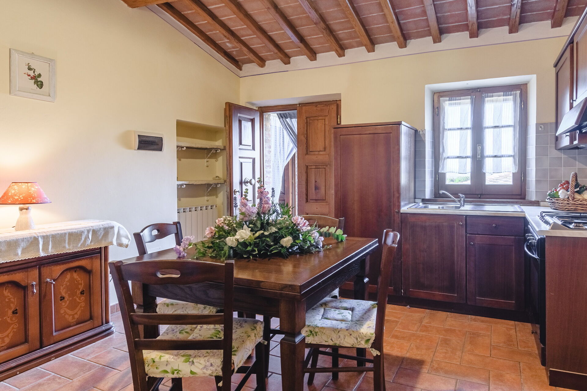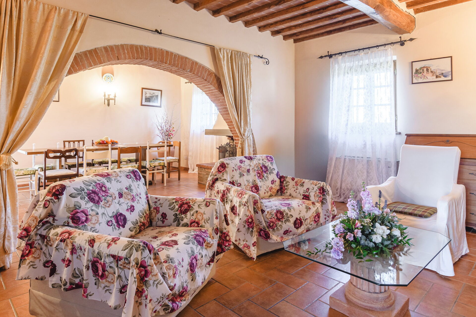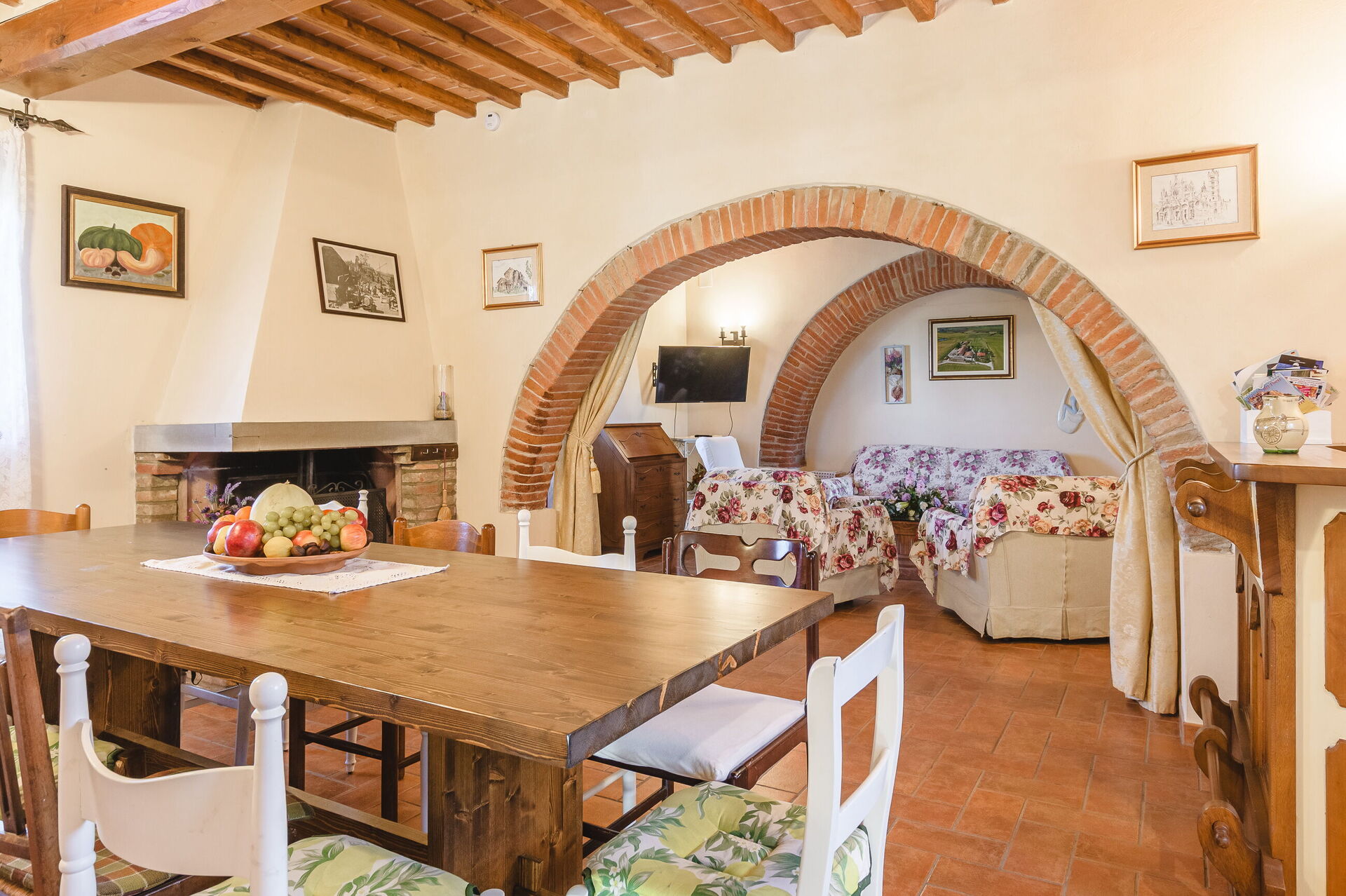 Nice stone-built farmhouse with private swimming pool in the Tuscan countryside, located into a big farm in the surroundings of Camucia, a short distance from the charming town of Cortona. The owners live nearby the villa and personally manage the farm producing wine, oil and cereals. The country house in divided into 3 apartments not connected internally, but set on the same building. On the ground floor there is a wide living room to share free time all together and offers a kitchen and a lounge/dining area. The further two apartments are located on the first floor of the building. The swimming pool is at 30m away from the entrance, near the owners house but to the exclusive use of the guests. In front of the farmhouse guests can enjoy a large furnished dining area with a barbecue, a wood over, table and chairs. the access to the villa is via a short path in good condition and suitable to any type of car. The position of this villa allows the guests to easily reach the most important sites of this area, such as Cortona, Arezzo Siena and Florence.