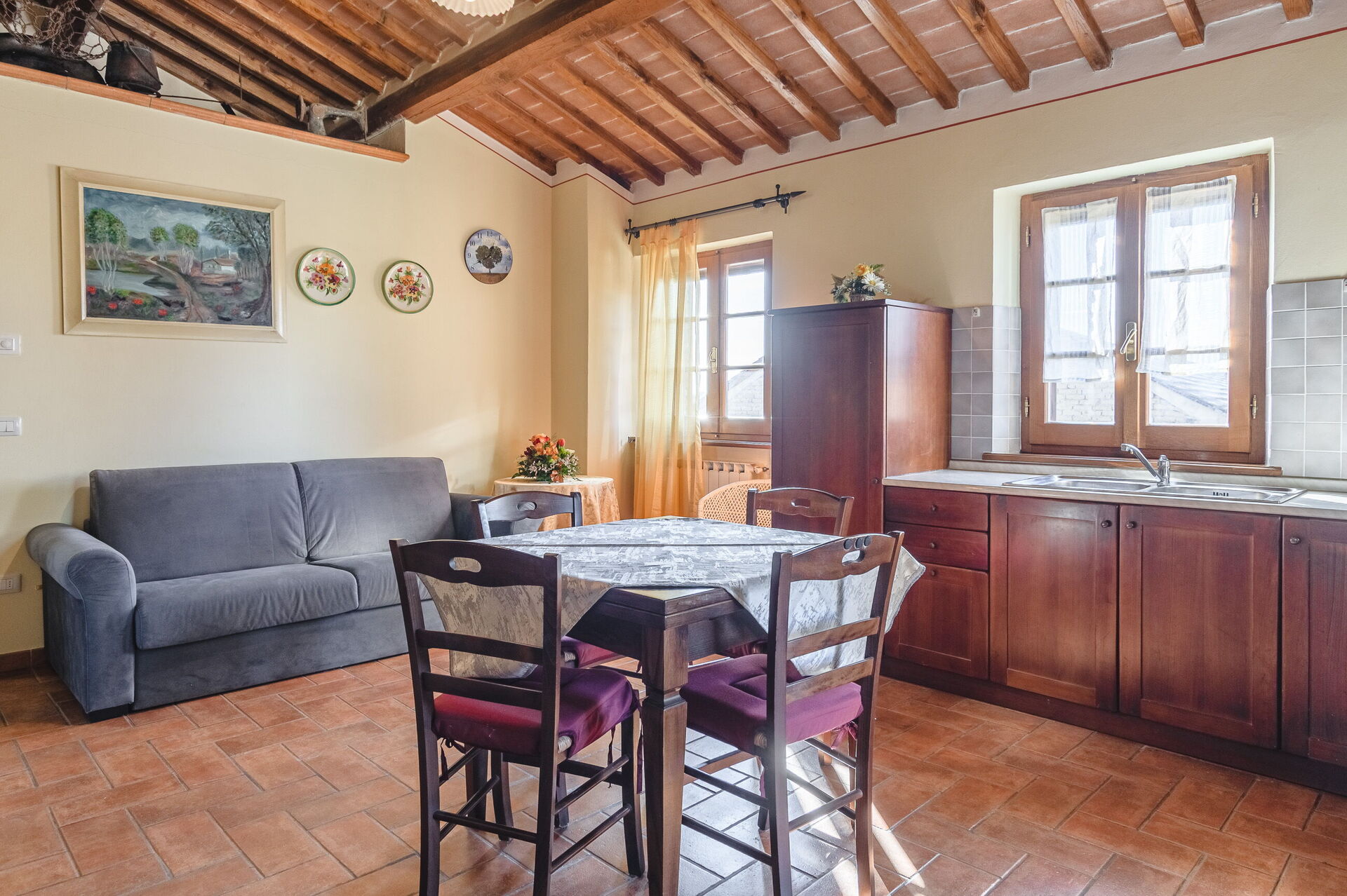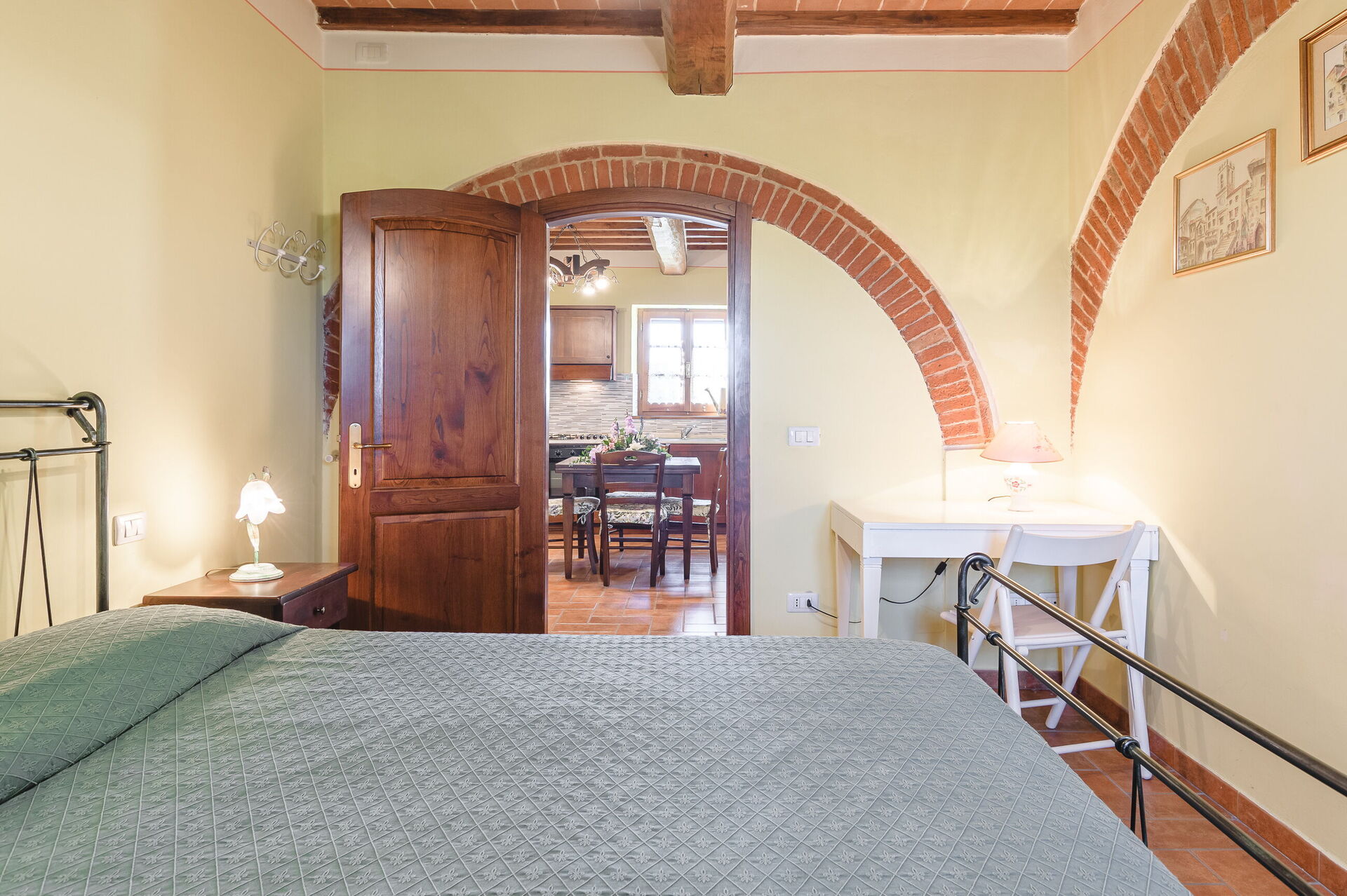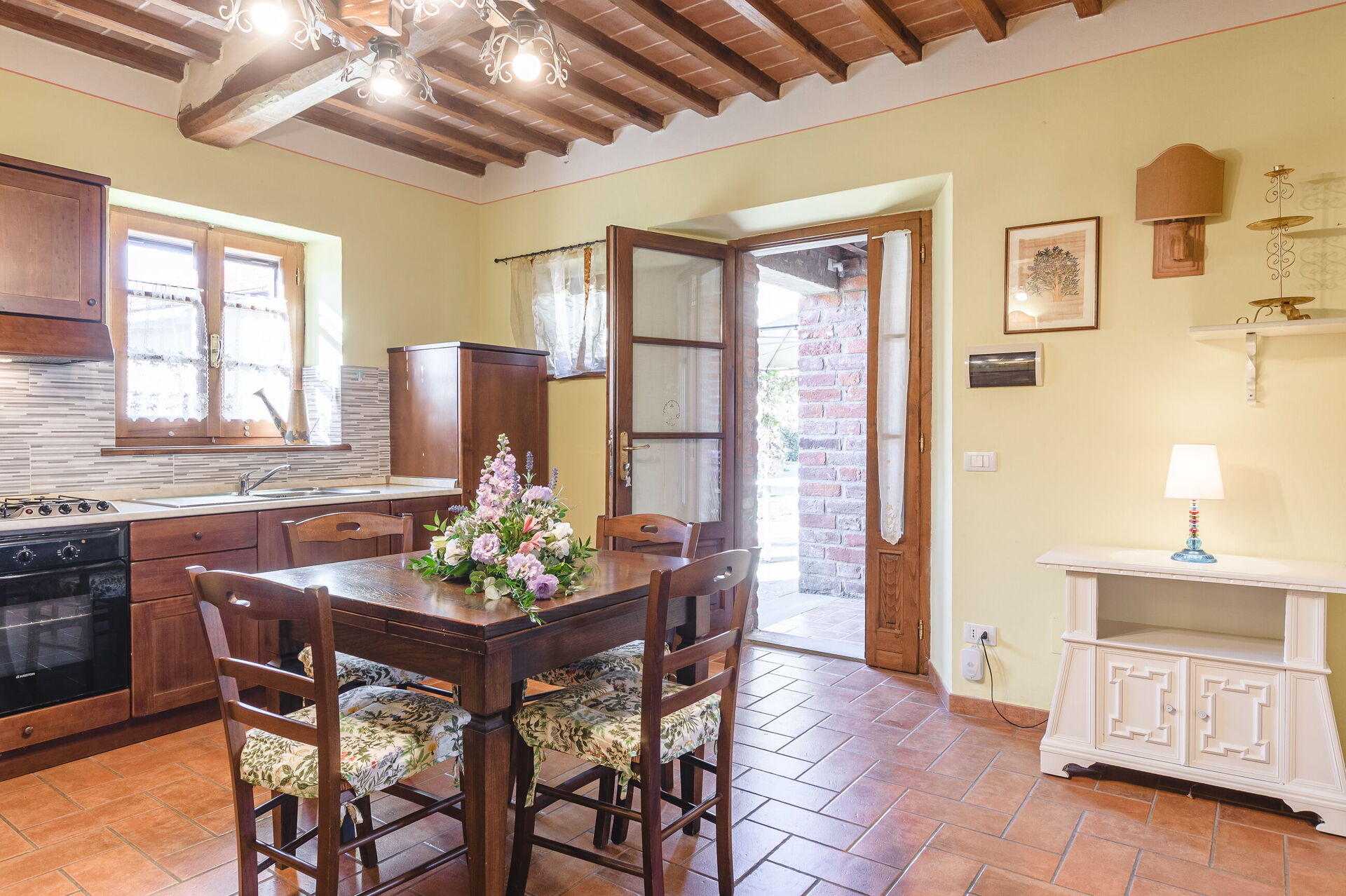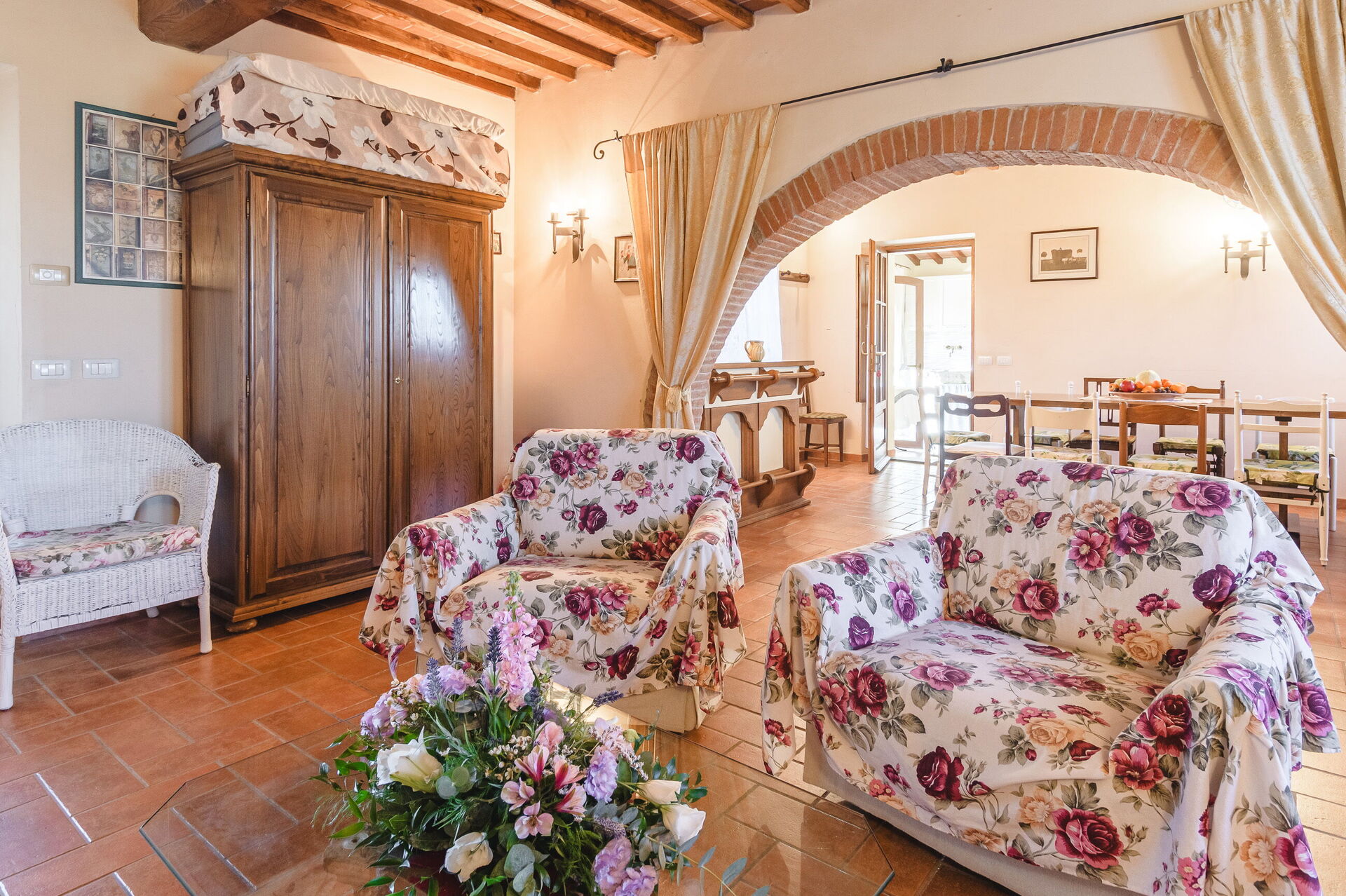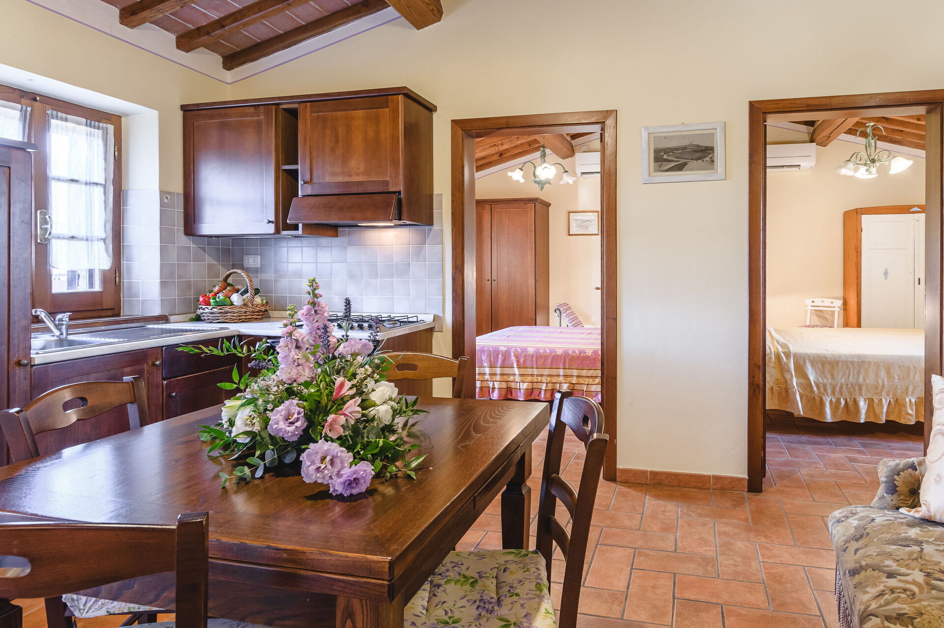 Nice stone-built farmhouse with private swimming pool in the Tuscan countryside, located into a big farm in the surroundings of Camucia, a short distance from the charming town of Cortona. The owners live nearby the villa and personally manage the farm producing wine, oil and cereals. The country house in divided into 3 apartments not connected internally, but set on the same building. On the ground floor there is a wide living room to share free time all together and offers a kitchen and a lounge/dining area. The further two apartments are located on the first floor of the building. The swimming pool is at 30m away from the entrance, near the owners house but to the exclusive use of the guests. In front of the farmhouse guests can enjoy a large furnished dining area with a barbecue, a wood over, table and chairs. the access to the villa is via a short path in good condition and suitable to any type of car. The position of this villa allows the guests to easily reach the most important sites of this area, such as Cortona, Arezzo Siena and Florence.