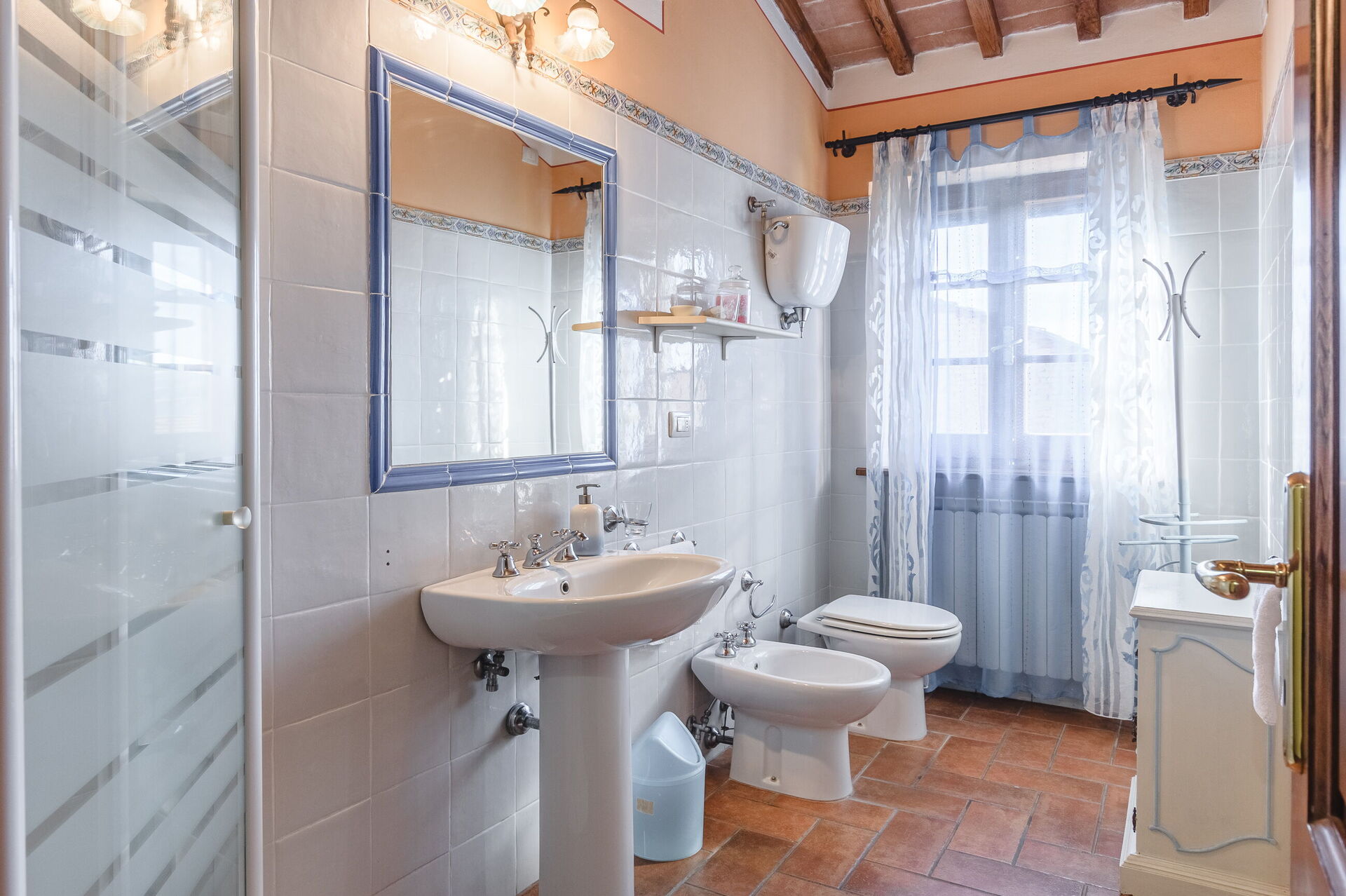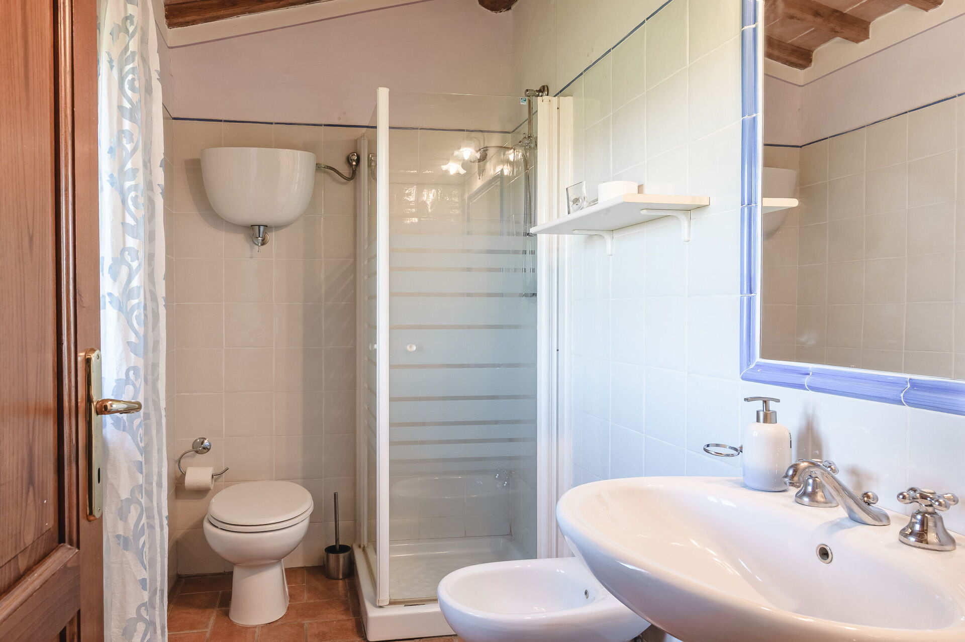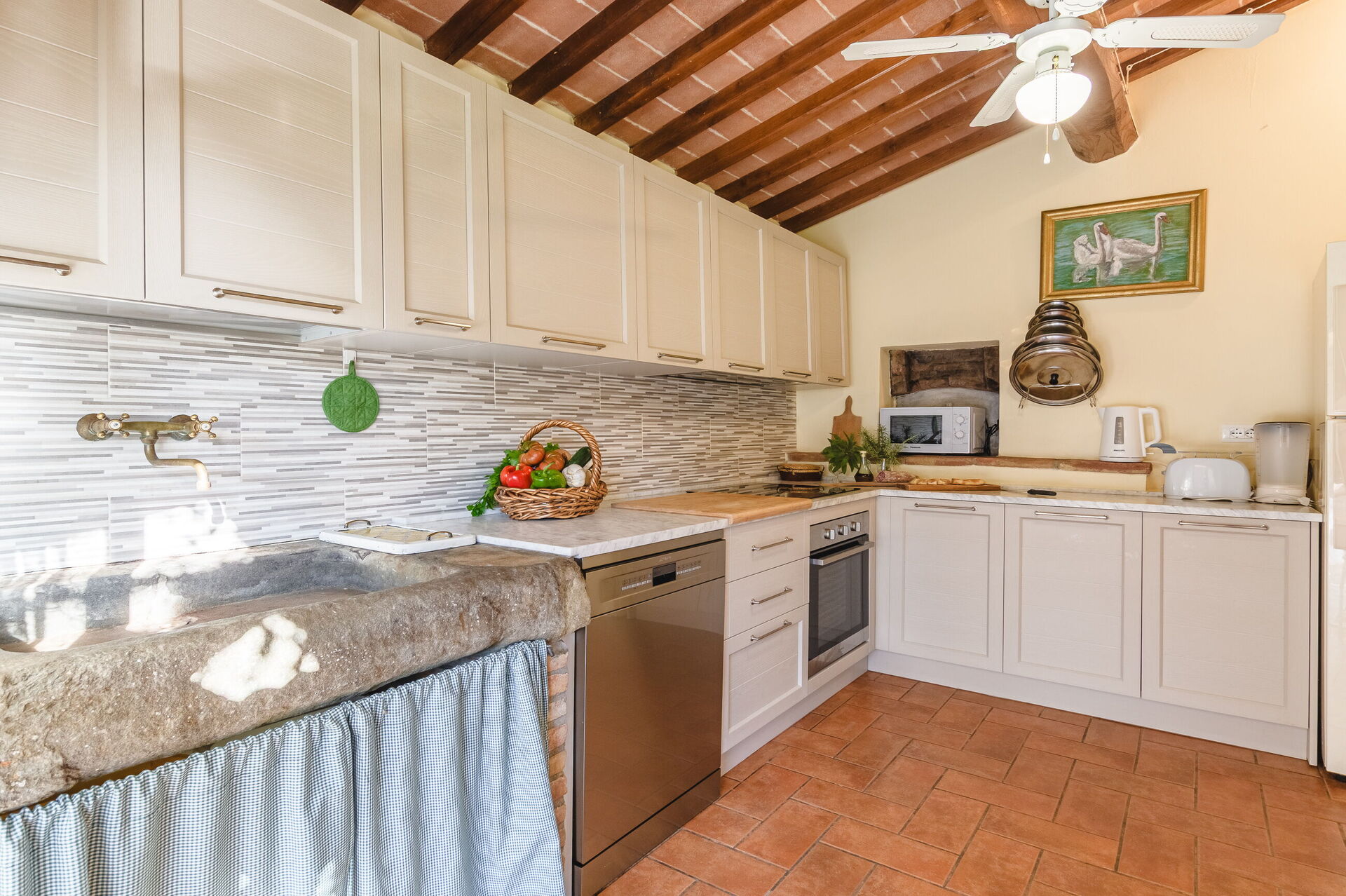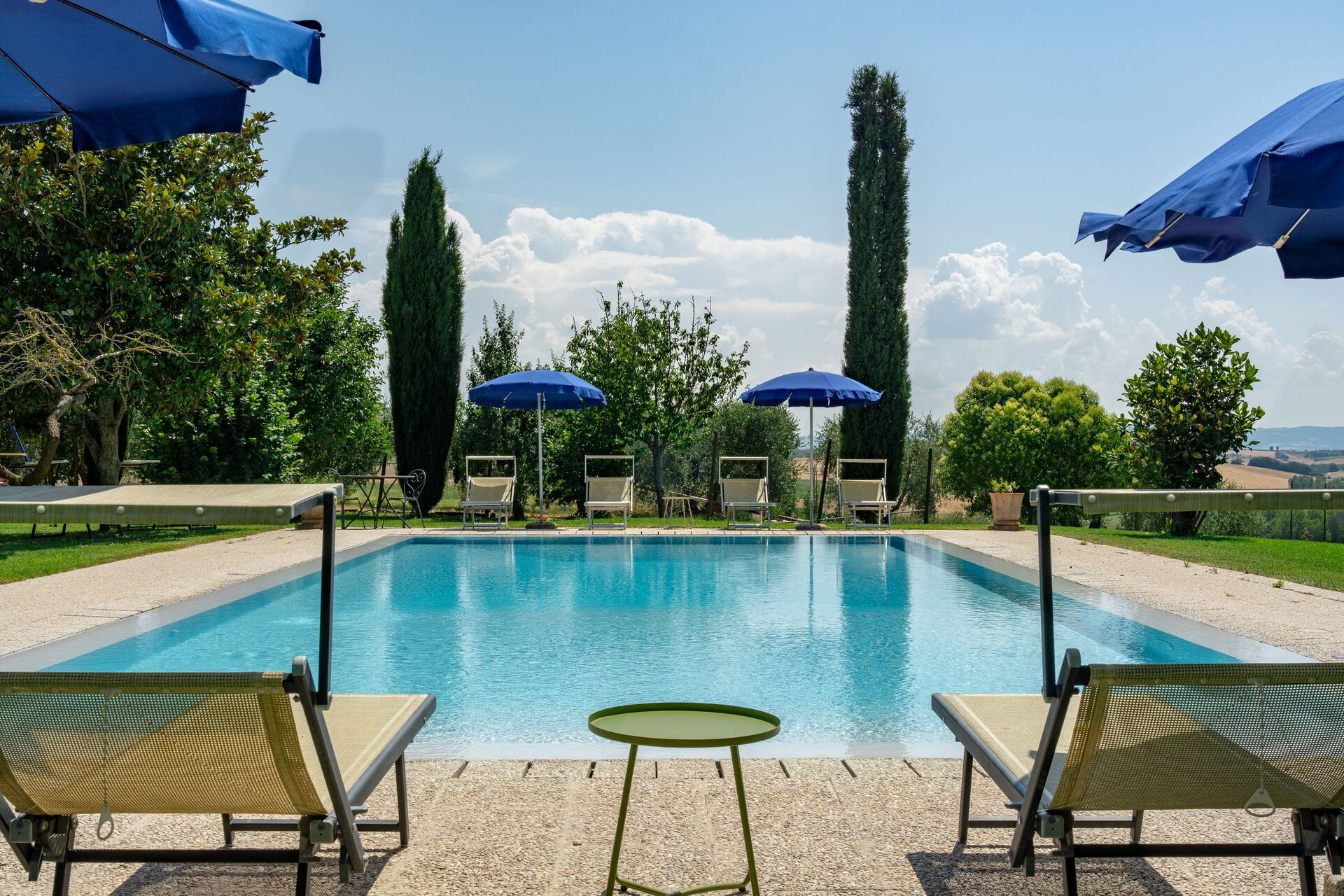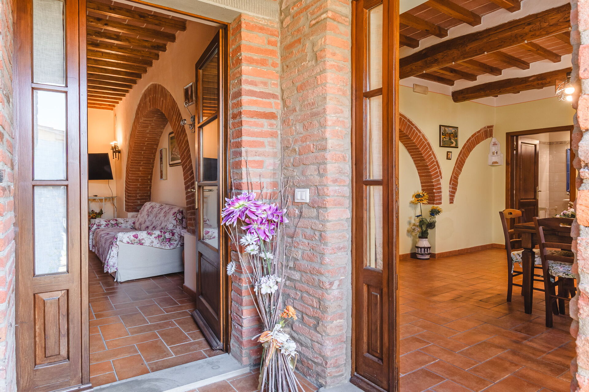 Nice stone-built farmhouse with private swimming pool in the Tuscan countryside, located into a big farm in the surroundings of Camucia, a short distance from the charming town of Cortona. The owners live nearby the villa and personally manage the farm producing wine, oil and cereals. The country house in divided into 3 apartments not connected internally, but set on the same building. On the ground floor there is a wide living room to share free time all together and offers a kitchen and a lounge/dining area. The further two apartments are located on the first floor of the building. The swimming pool is at 30m away from the entrance, near the owners house but to the exclusive use of the guests. In front of the farmhouse guests can enjoy a large furnished dining area with a barbecue, a wood over, table and chairs. the access to the villa is via a short path in good condition and suitable to any type of car. The position of this villa allows the guests to easily reach the most important sites of this area, such as Cortona, Arezzo Siena and Florence.
