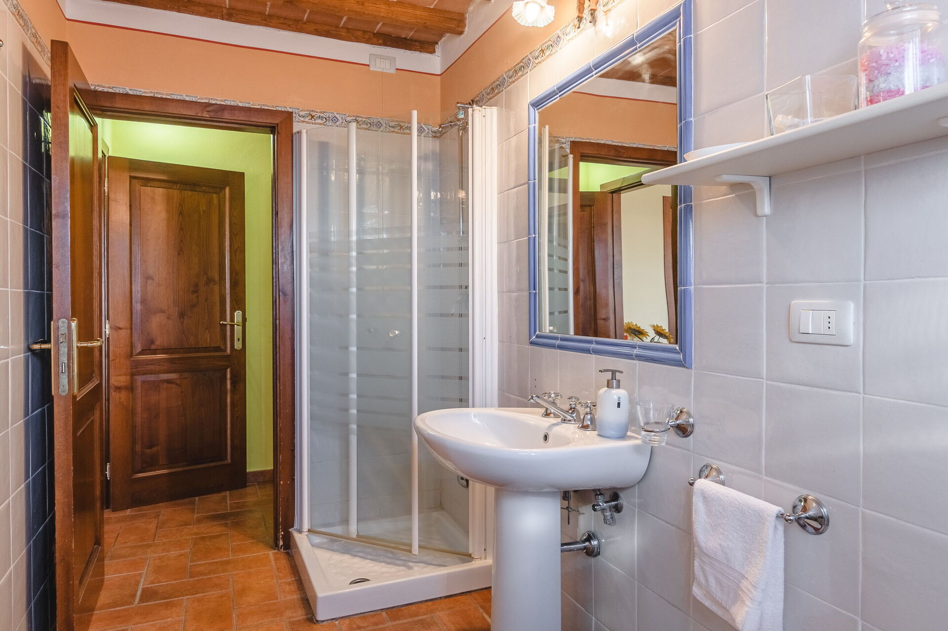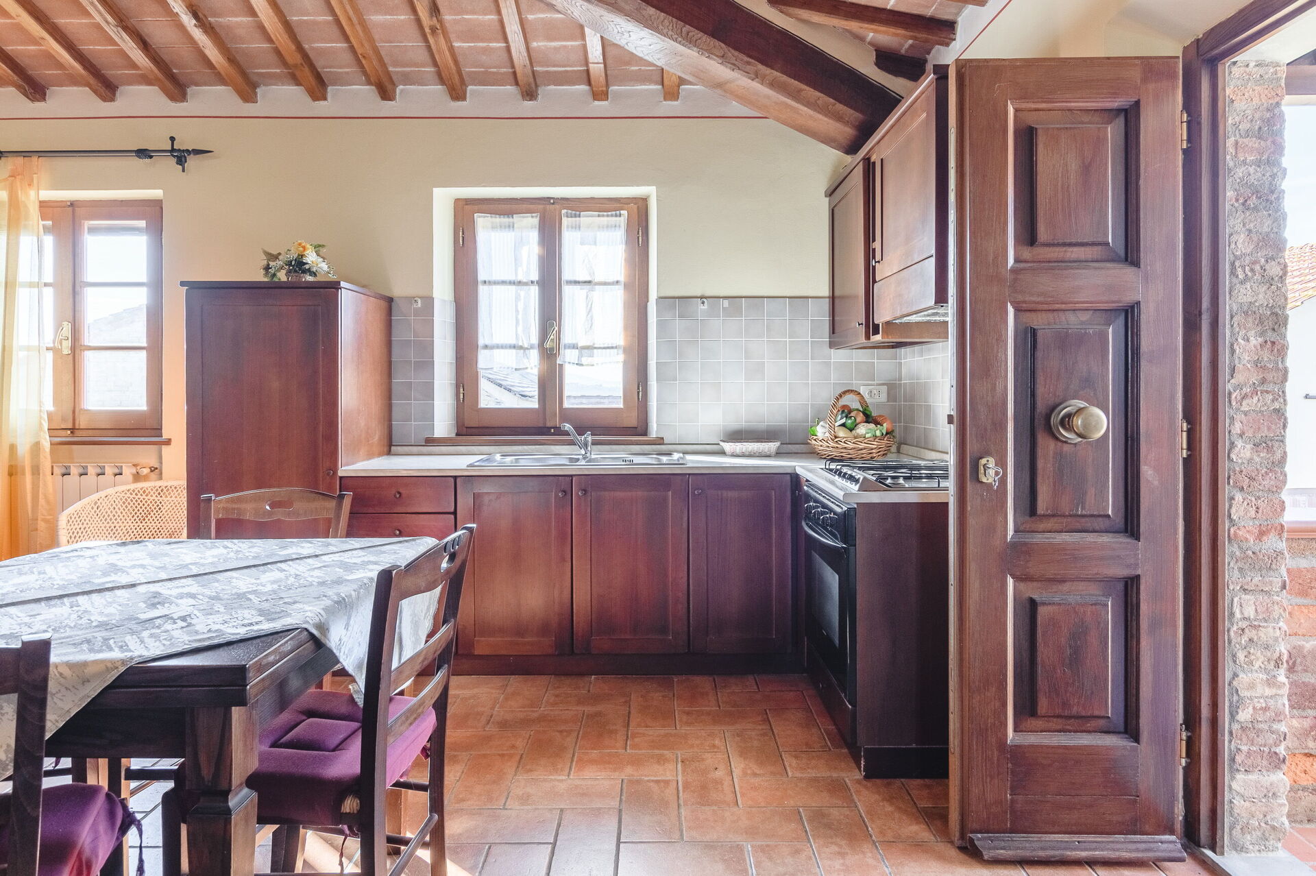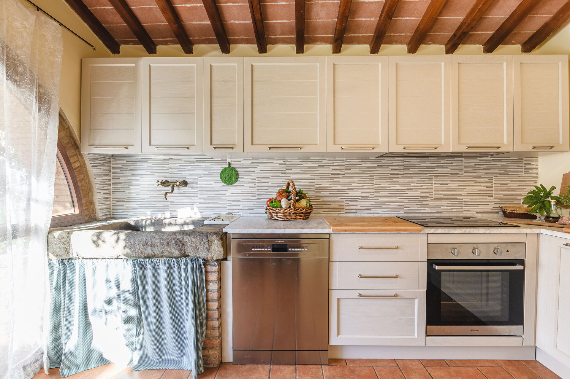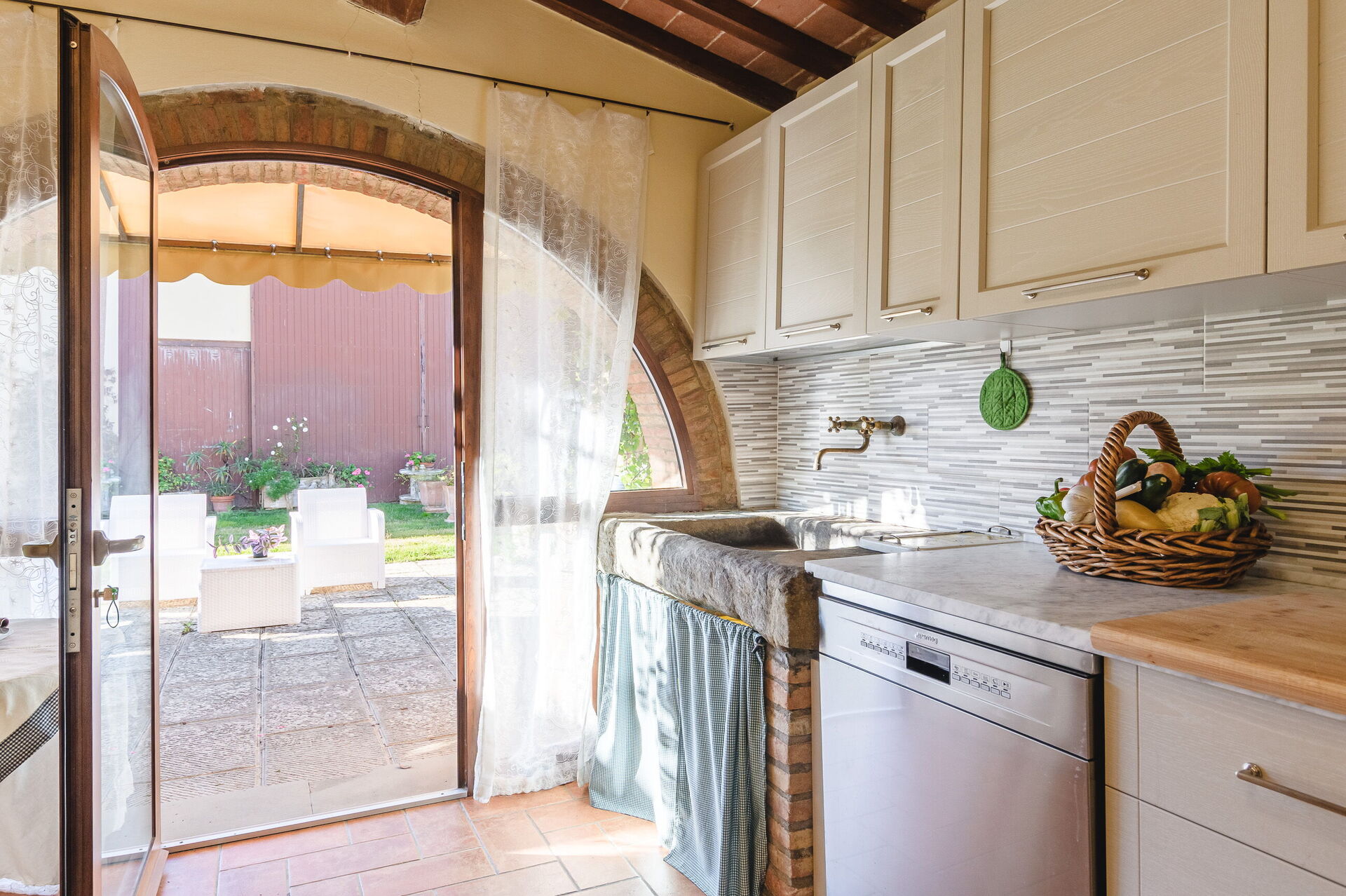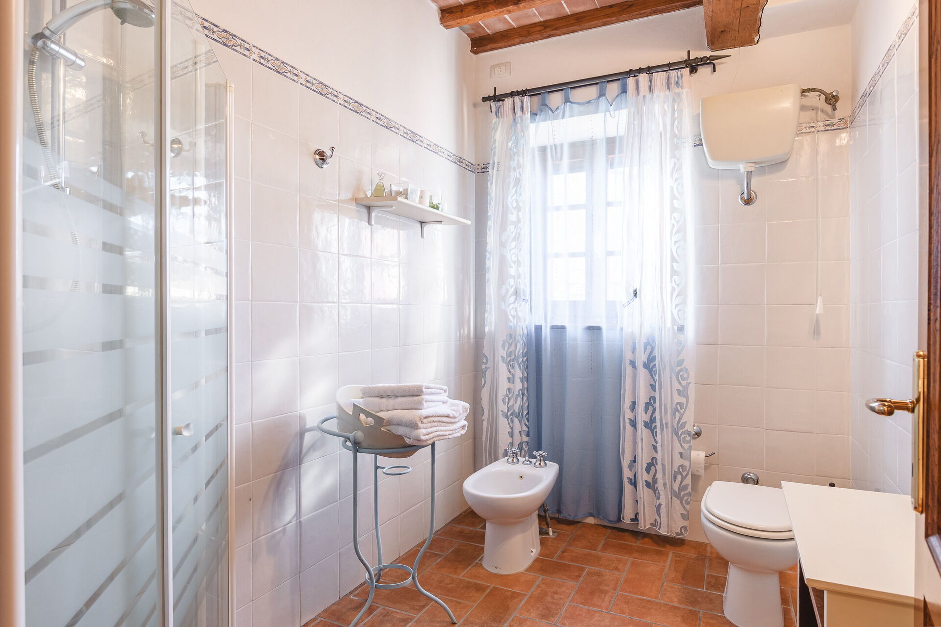 Nice stone-built farmhouse with private swimming pool in the Tuscan countryside, located into a big farm in the surroundings of Camucia, a short distance from the charming town of Cortona. The owners live nearby the villa and personally manage the farm producing wine, oil and cereals. The country house in divided into 3 apartments not connected internally, but set on the same building. On the ground floor there is a wide living room to share free time all together and offers a kitchen and a lounge/dining area. The further two apartments are located on the first floor of the building. The swimming pool is at 30m away from the entrance, near the owners house but to the exclusive use of the guests. In front of the farmhouse guests can enjoy a large furnished dining area with a barbecue, a wood over, table and chairs. the access to the villa is via a short path in good condition and suitable to any type of car. The position of this villa allows the guests to easily reach the most important sites of this area, such as Cortona, Arezzo Siena and Florence.