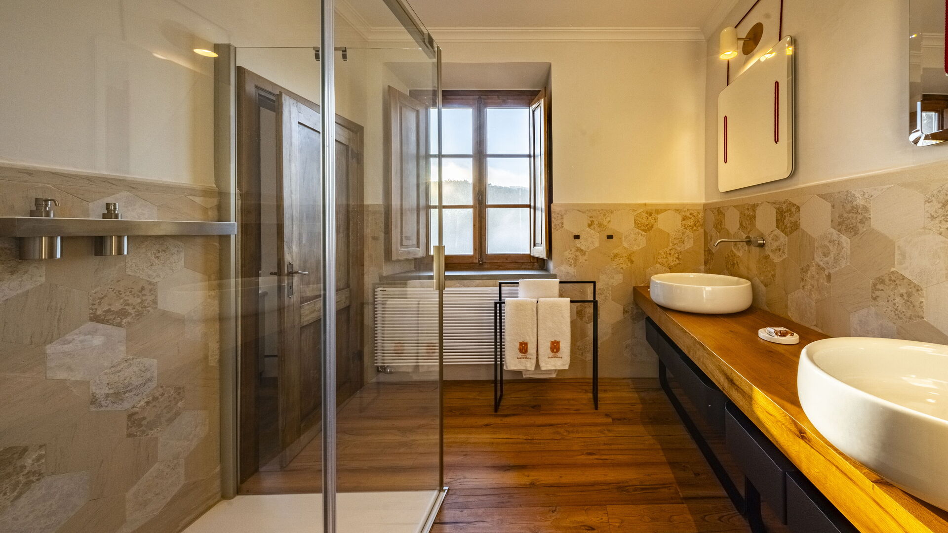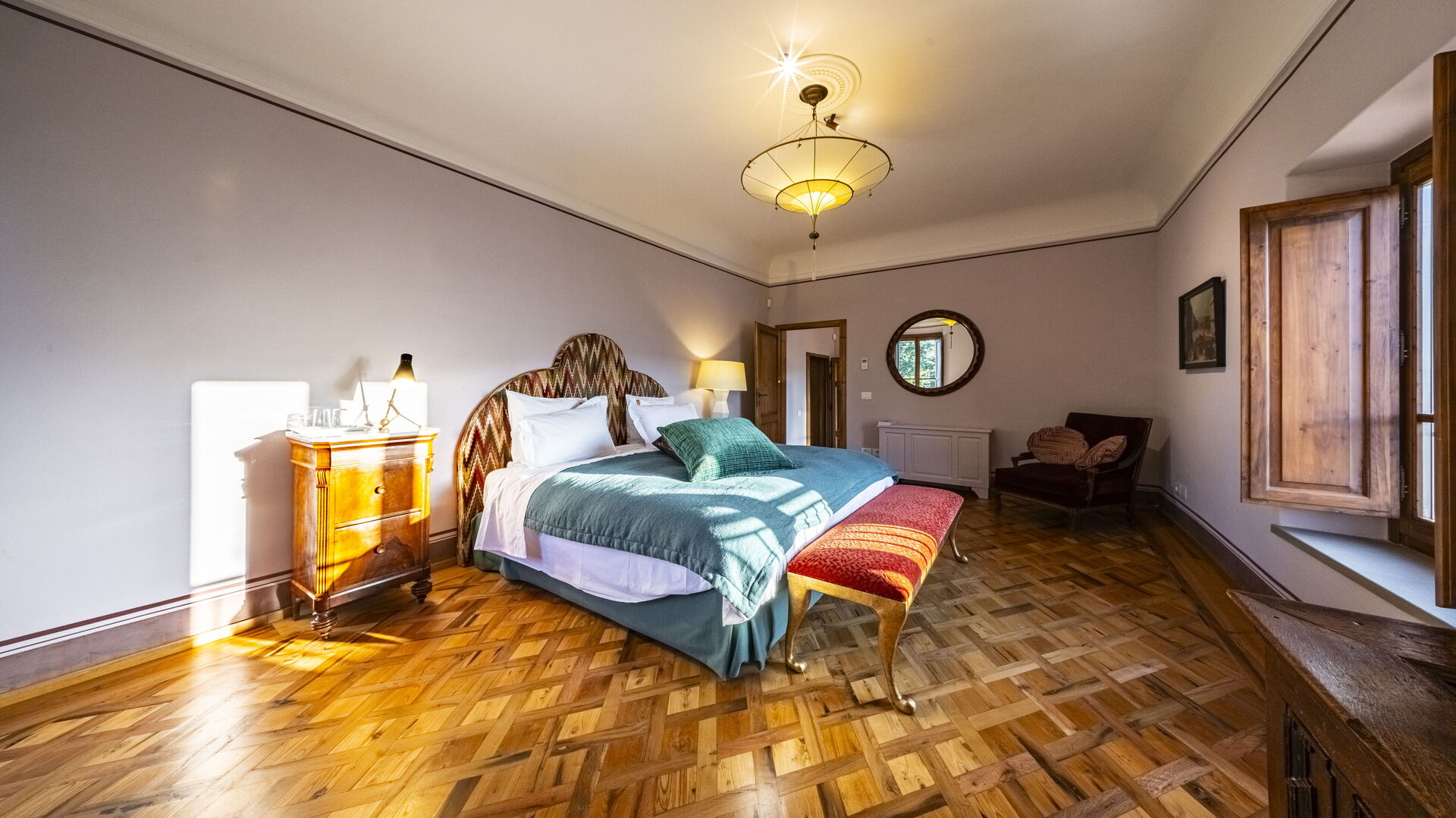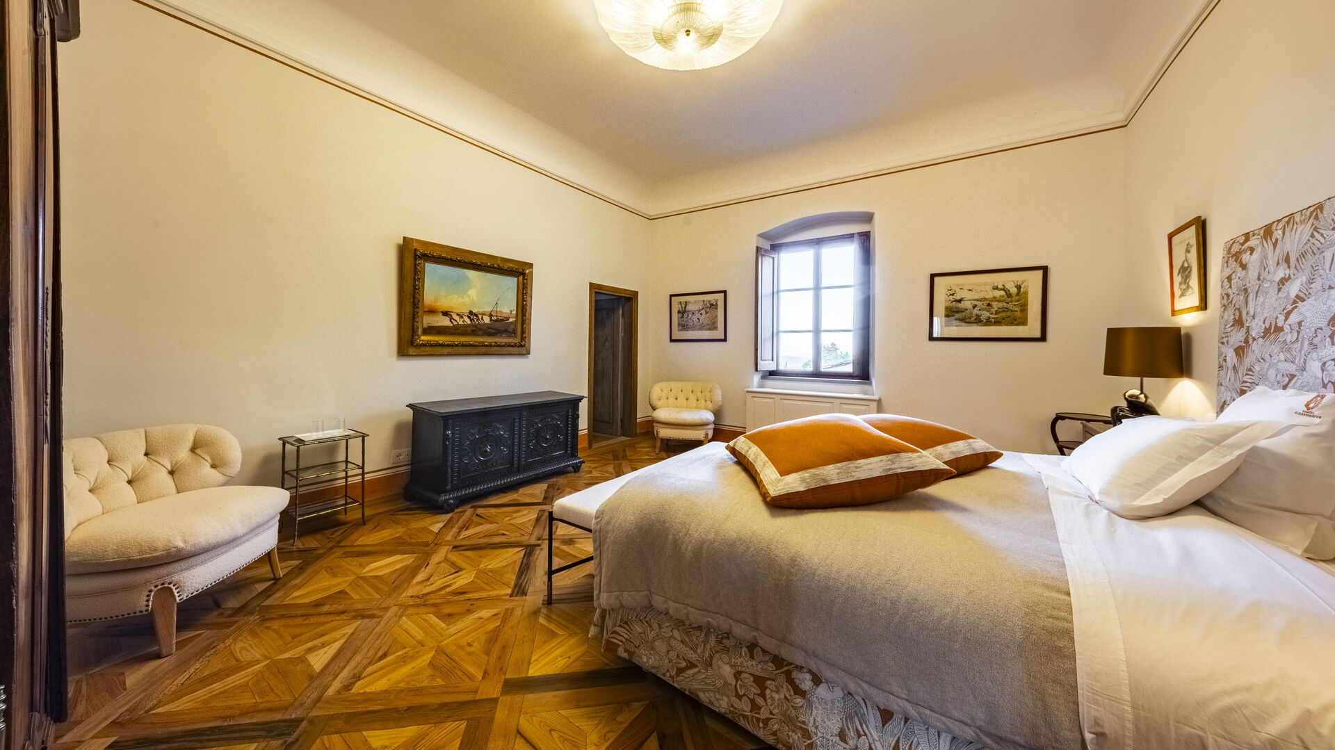 Eerste verdieping: 4 tweepersoonsslaapkamers, elk met een eigen badkamer met douche; 1 suite met kleine woonkamer, slaapkamer (1 trede omhoog) met tweepersoonsbed en eigen badkamer met douche.