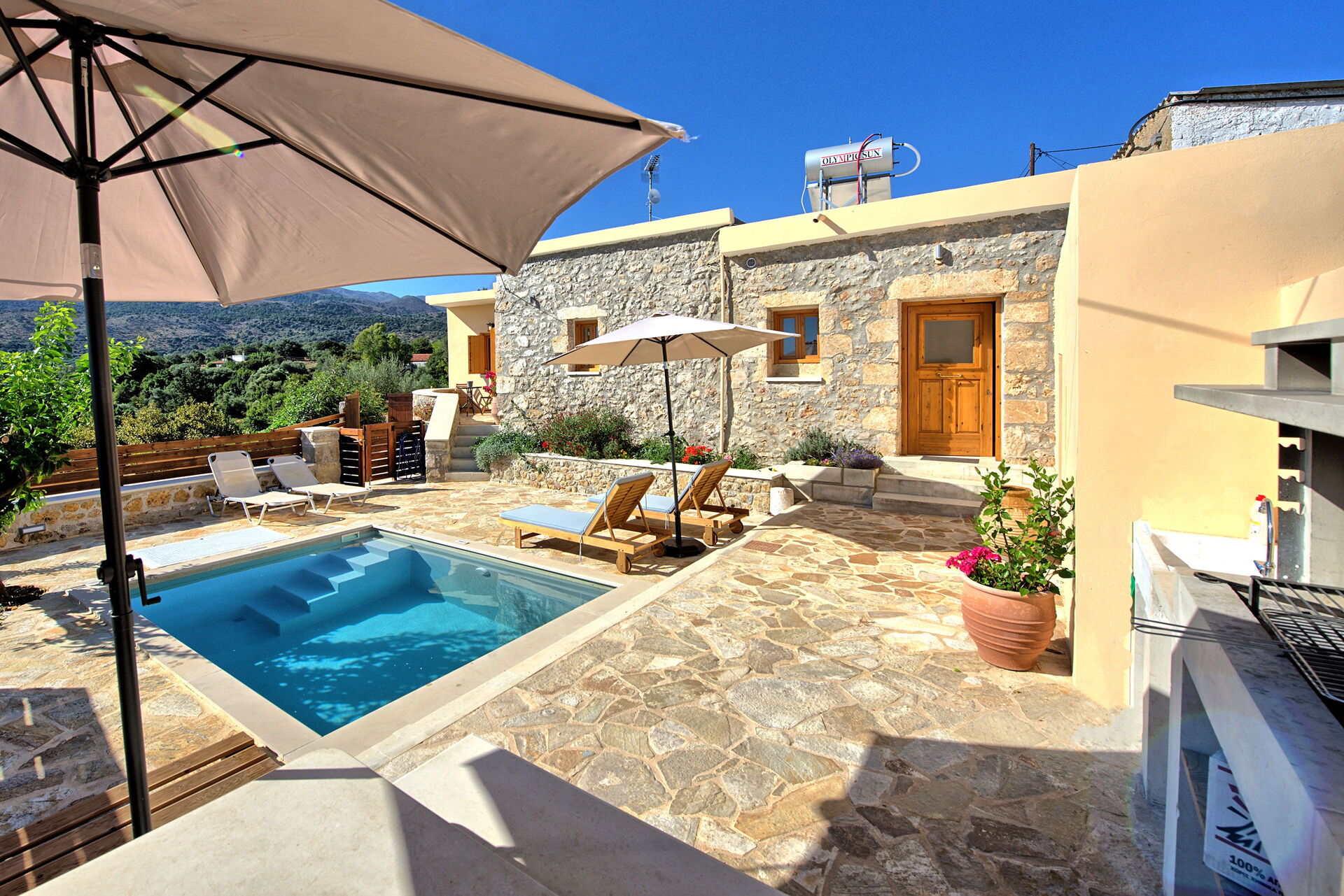 At the disposal of guests of this beautiful Crete country vacation villa: private, enclosed outdoor space; private pool (4 x 3,30 meters; minimum depth: 1,40 meters; maximum depth: 1,40 meters); outdoor table, chairs and barbecue; private parking about 15 meters from the house; outdoor shower; accommodation for up to 4/5 people: ideal for a couple or a family; air conditioning; Wifi internet