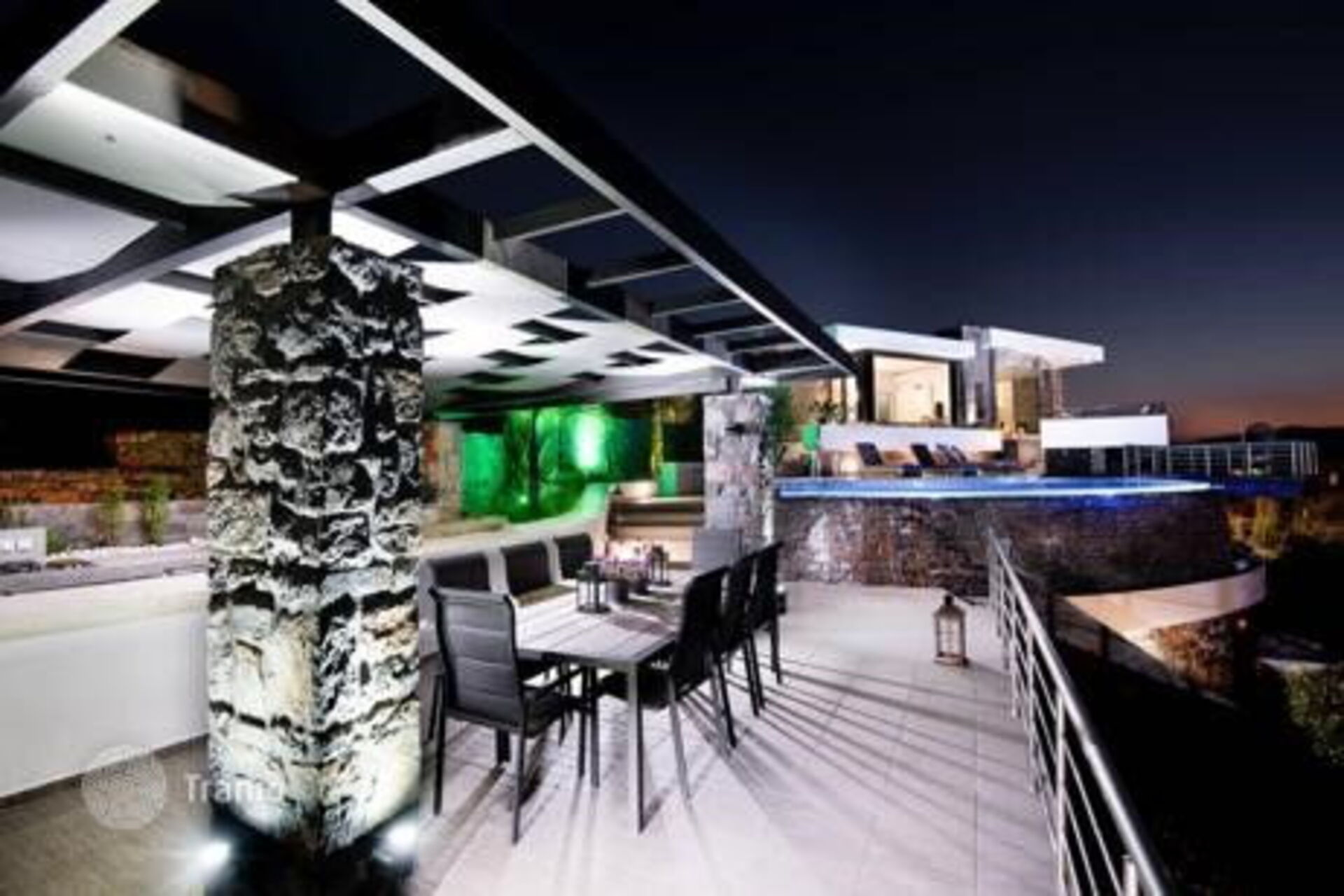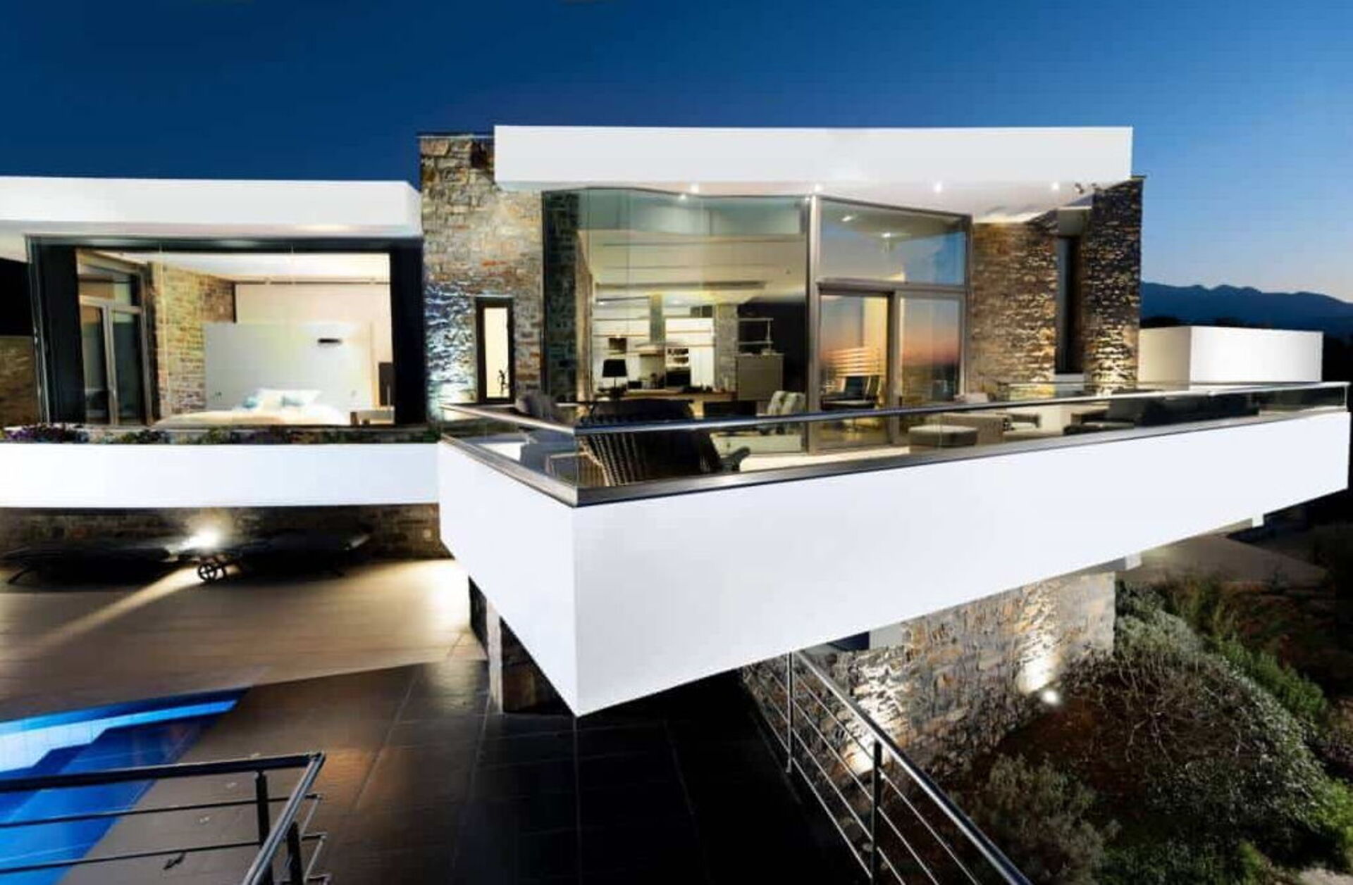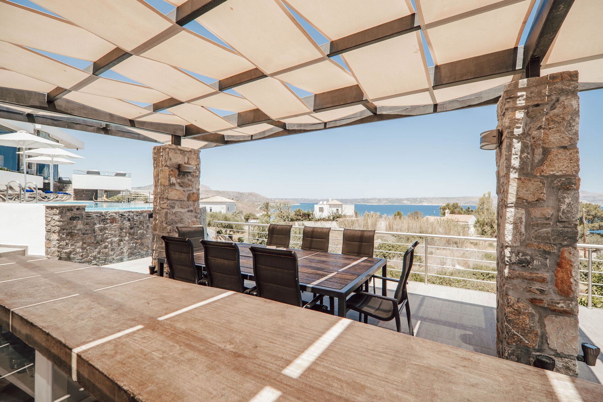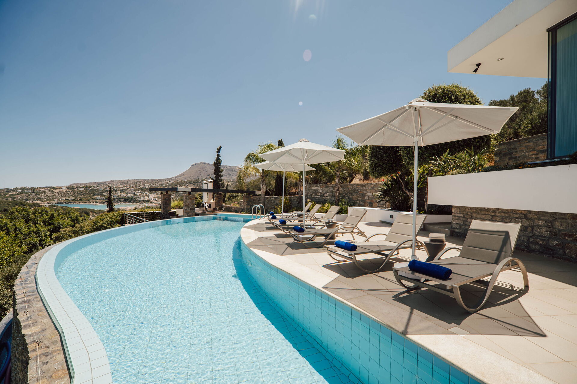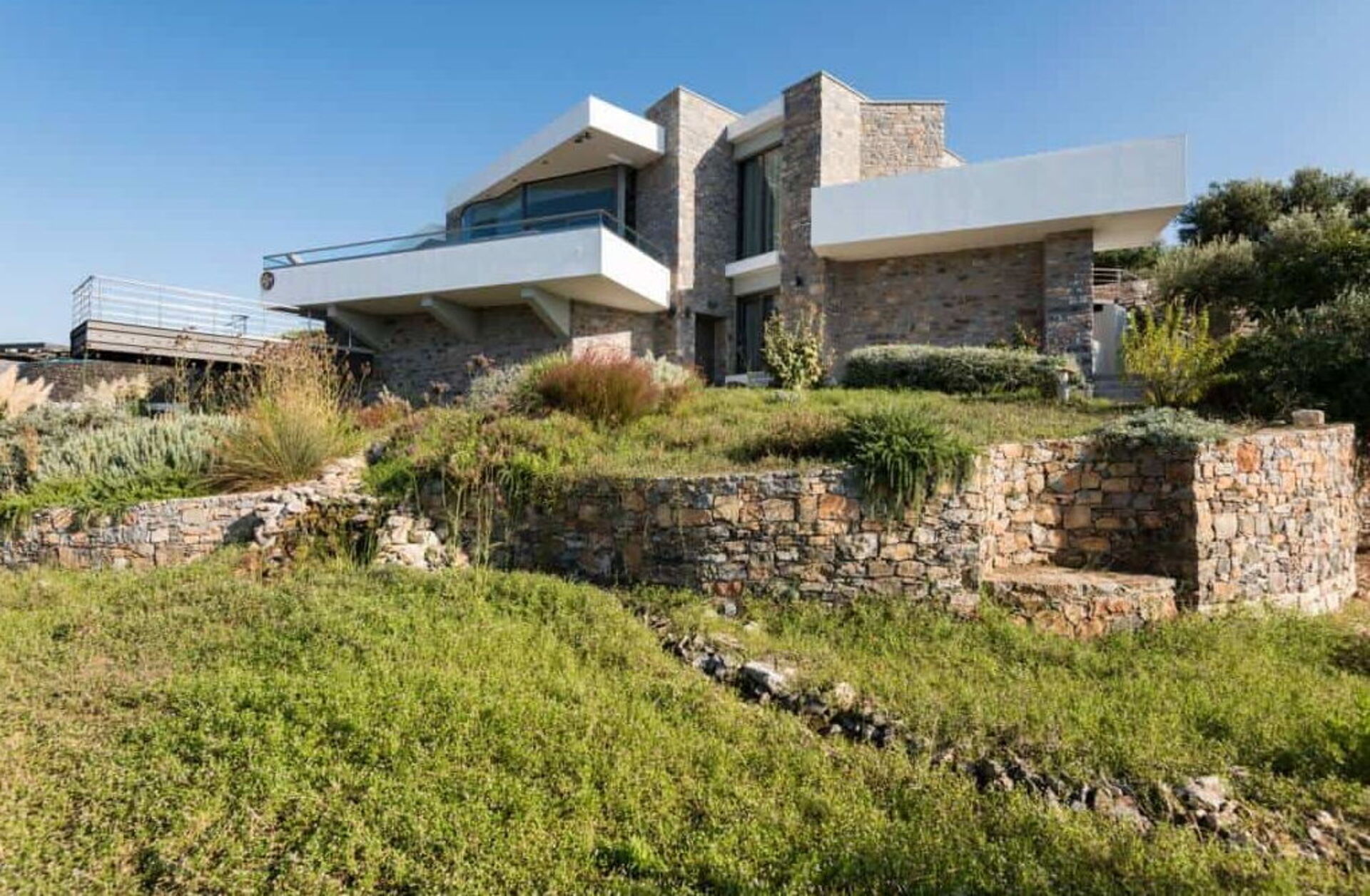 The villa is surrounded by scenic terraces with beautiful views of the sea and surrounding landscape.