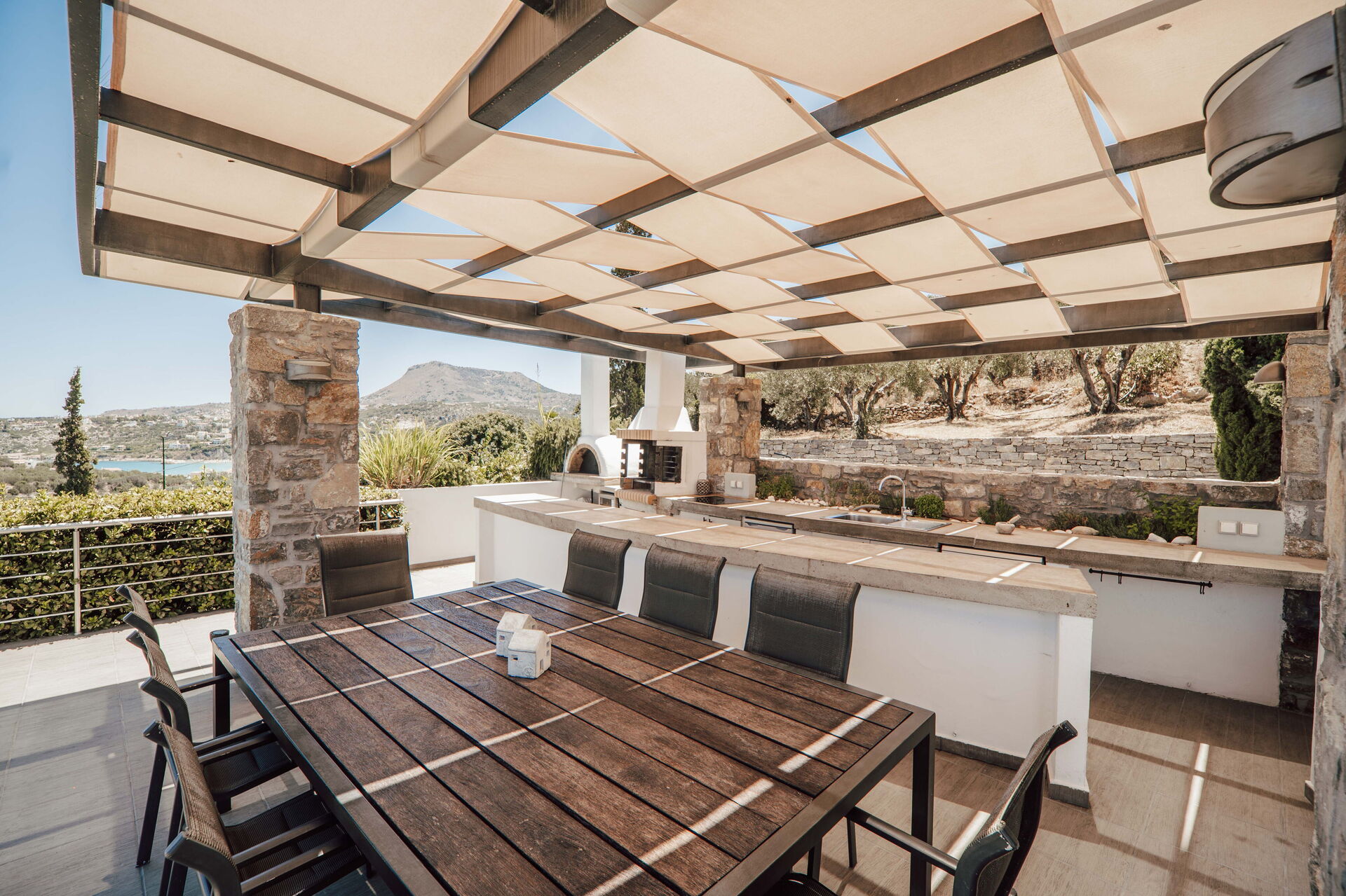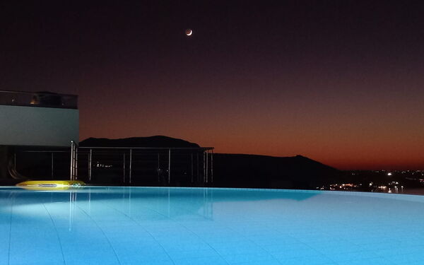 A stunning villa. Every bedroom was fantastic with comfortable beds. Master bedroom had the most beautiful views, as did the balcony and pool. The outdoor kitchen is very special and there was the lovely touch of herbs growing behind the worktop so you could use these if you wanted. At night this whole outdoor area was beautiful. There is a small cove a 10 minute walk away - steep hill back but I liked the walk. Almyrida was a ten minute walk away and all the restaurants were fabulous. Beach there is also fabulous. I’d advise taxi back at night as it’s pitch black on road, but it was only 6/7 euros for four of us or 10 euros if five of us. The coffee shop and mini market, a couple of minute walk away, was fabulous for coffee and ice creams. Very friendly. Stroll into Almyrida for a bigger shop that sells fruit, salad, veg and a greater selection of food. Our host, Vivian, was very helpful and even organised a perfectly placed table on the beachfront at Elia & Thyme for my mum’s birthday, along with the most dazzling and delectable dessert. The villa really is gorgeous and well placed.