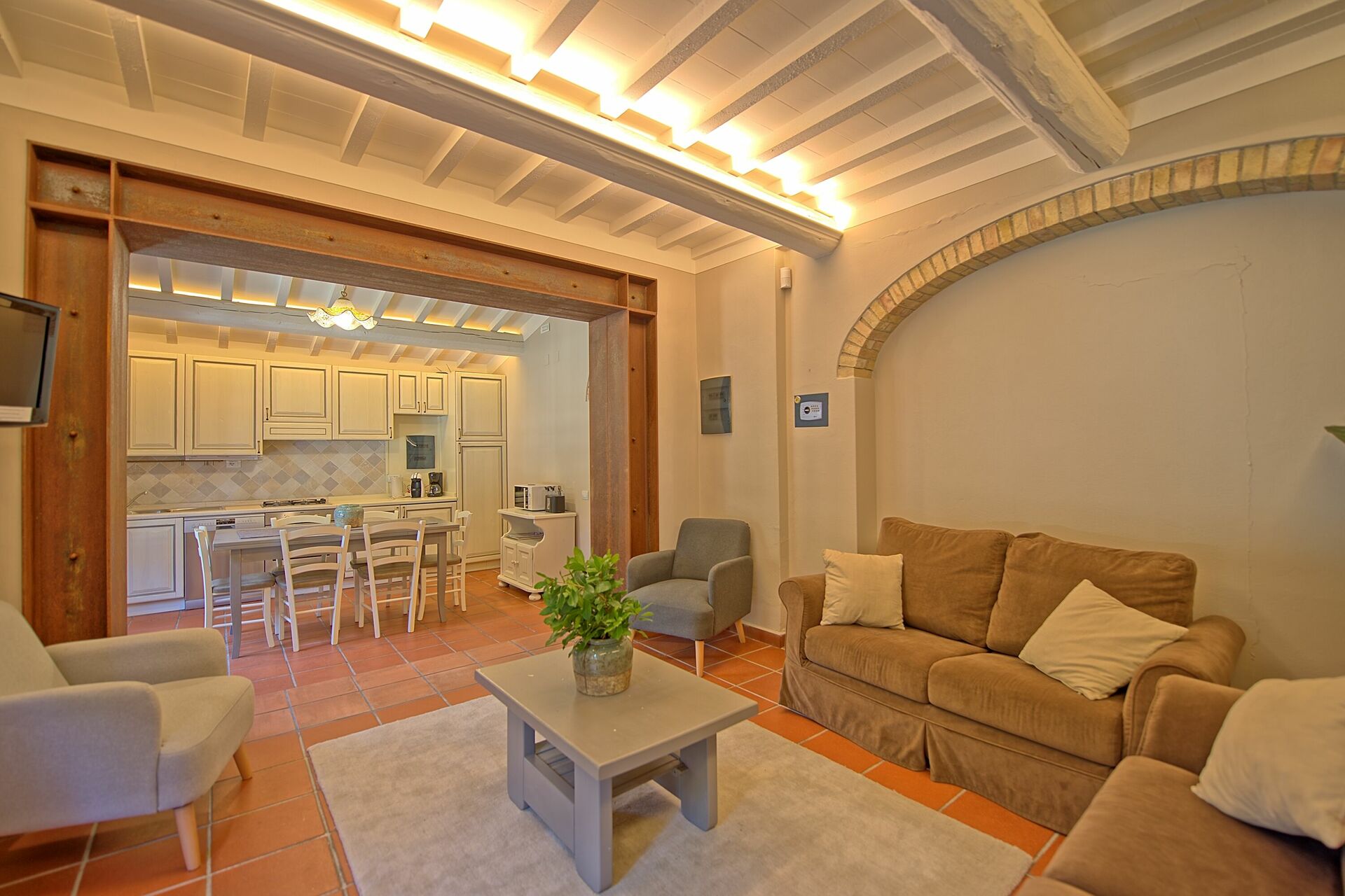 Bottenvåning: stort vardagsrum med matplats och kök (ugn, frys, mikrovågsugn, diskmaskin), dubbelrum (luftkonditionering) med eget badrum med dusch, tvåbäddsrum med luftkonditionering, badrum med dusch.